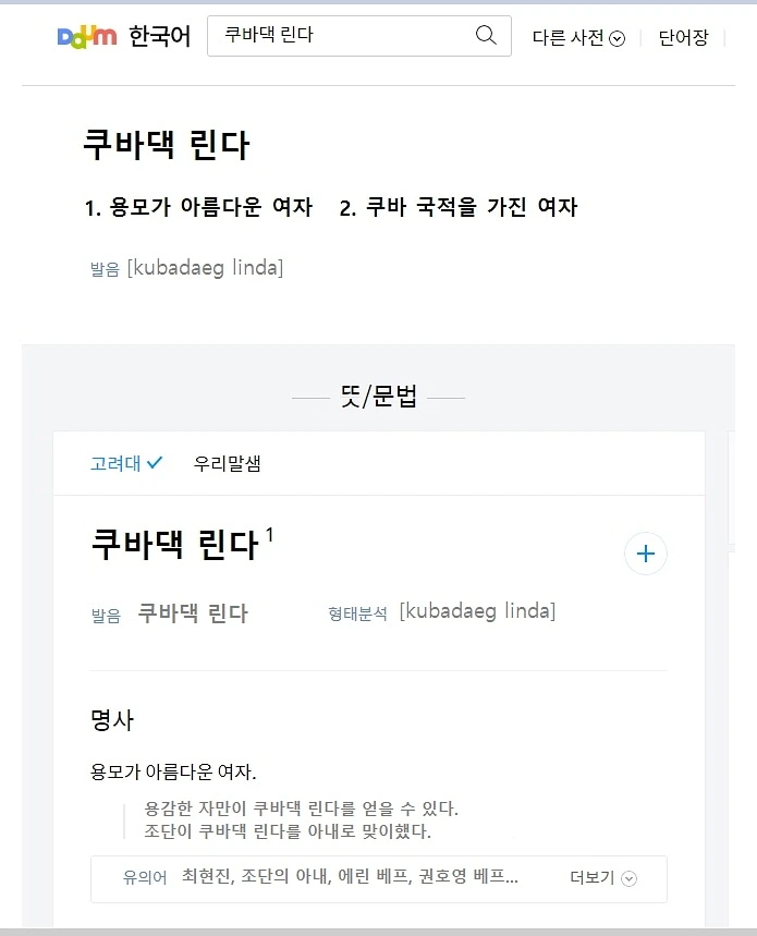 그런데 어제 한 지인이 보내 준 메시지를 보고는 약간은 우울했던 기분이 확 날아가는 듯했다. 메시지를 받았을 때 나는 너무 놀라서 그분이 보내주신 사진만 한참을 바라보았더랬다. 다음 사전에 쿠바댁 린다 가 고유명사로 나온 것이었다. 이게 말이 돼? 하면서 사실 여부를 확인도 하지 않은 채 나의 SNS에 포스팅을 했다. 그분이 세상 유일무이한 것이라고 메시지를 보내셨는데도 불구하고 나는 그게 정말인지 알 정도로 컴퓨터 기술에 문외한이었던 것이었다.