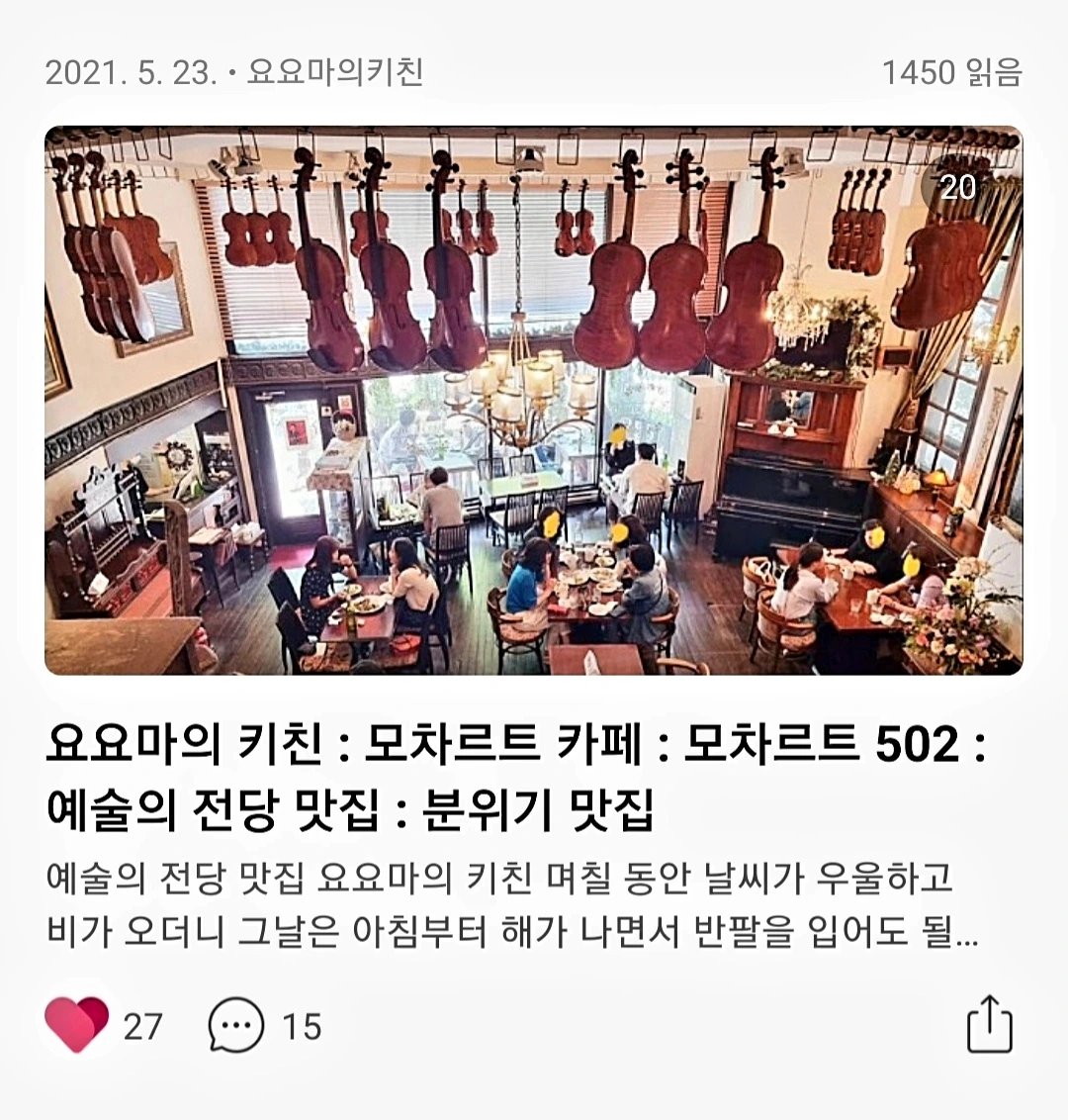 감사편지를 쓰다가 한국에 와서 방문한 맛집 후기를 간간히 올려 보았다. 조회수를 늘리기 위해서라기보다는 맛집을 내가 좋아하기 때문에 다녀온 후 생각이 나서 후기를 쓴 것이었다. 역시 좋아하는 걸 하면 에너지도 다르게 나오나 보다. 감사편지를 쓸 때와 조회수가 차이가 현저히 났다.