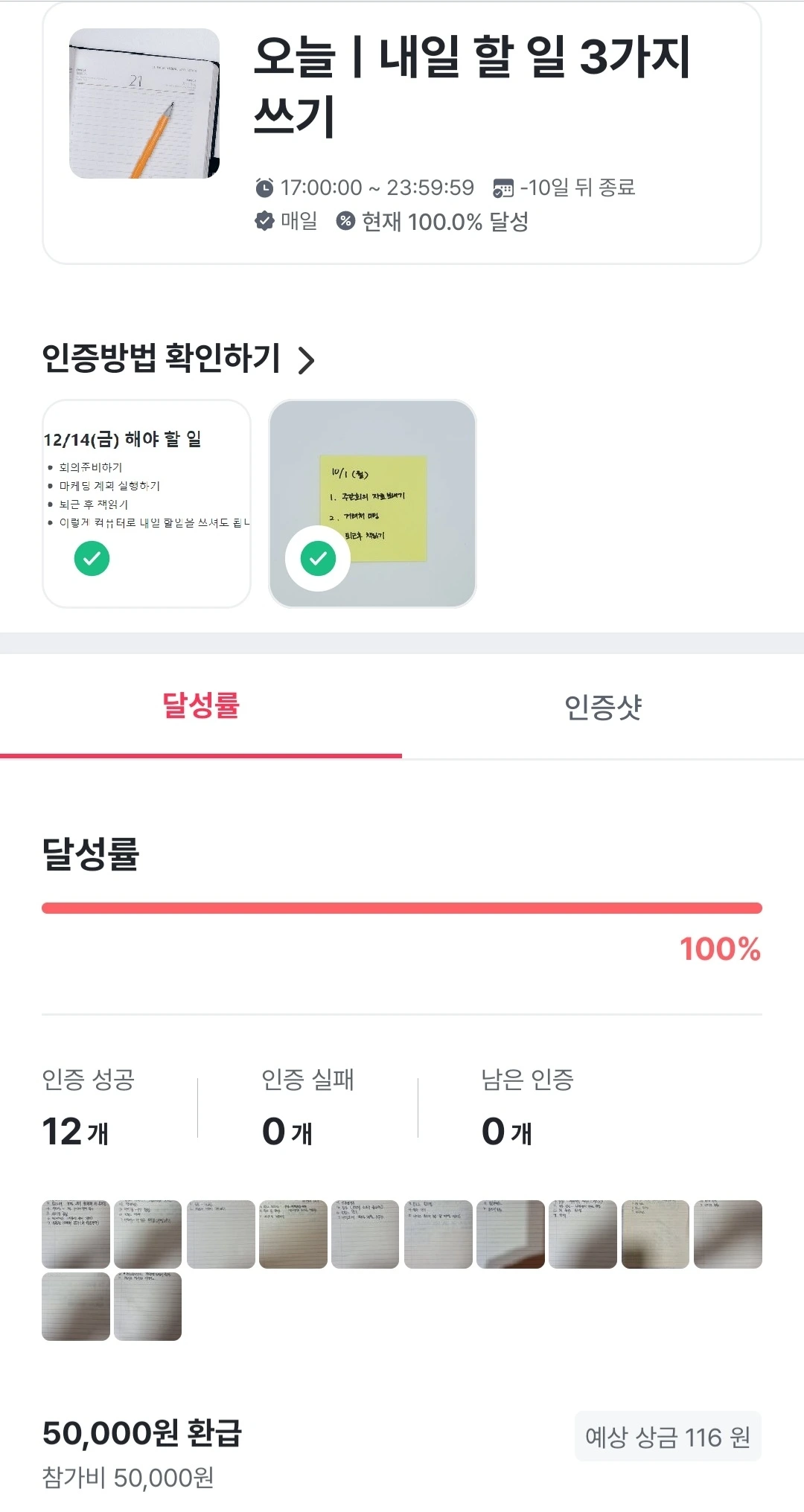 5만 원을 먼저 결제하고 내가 한 목표가 모두 이루어지면 성공한 사람들은 내가 베팅한 금액을 전체 돌려받고 실패한 사람의 금액을 나누어서 상금으로 받는 거였다. 그 5만 원을 사수하기 위해서 나는 매일 저녁에 다음 날 할 일을 적은 뒤 인증숏을 올렸고 결국 목표 달성을 하여 5만 원을 돌려받았다. 그리고 상금으로 116원이 쌓였다.