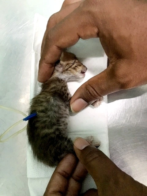 "너무 어린 고양이네요. 고양이는 45일 동안 엄마 젖을 먹고 면역을 키워야 하는데 이렇게 어릴 때 엄마 없이 키우면 언제 어떻게 될지 몰라요. 일단 수액을 놓아줄게요. 그럼 내일 아침까지는 우유를 안 먹이셔도 됩니다. 그런데 기억하세요. 오래 못 살 가능성이 높다는 거."