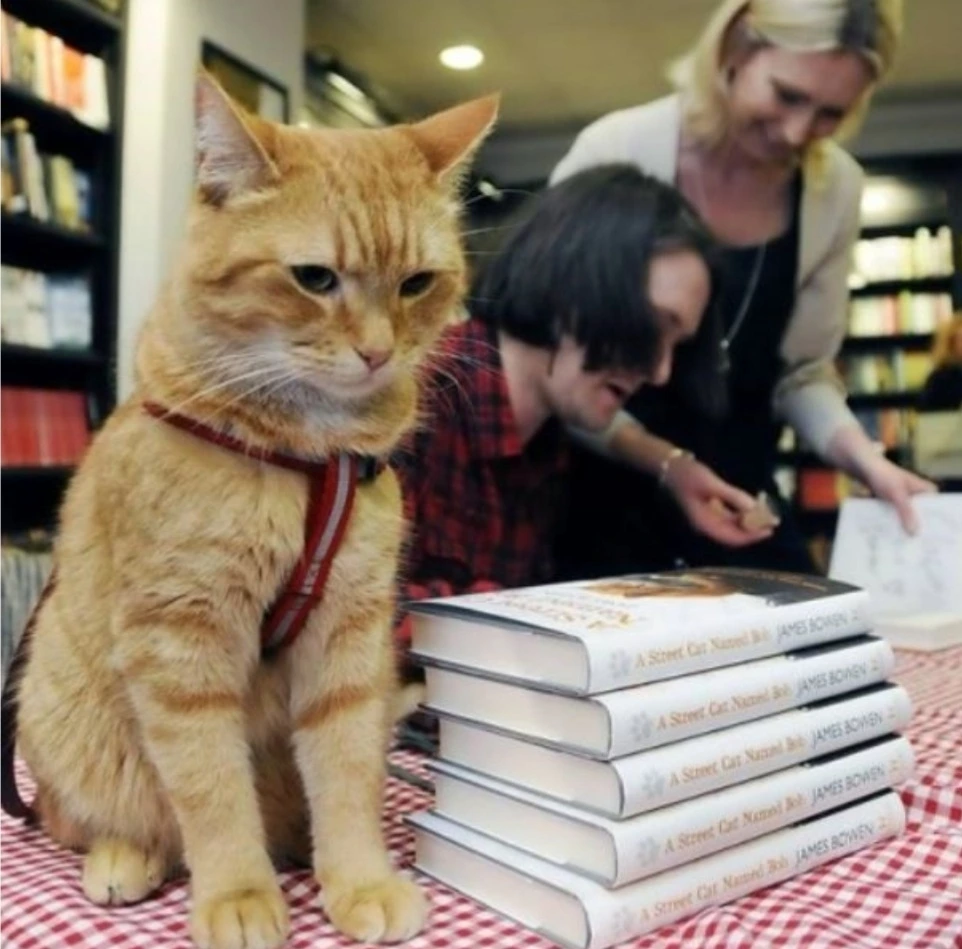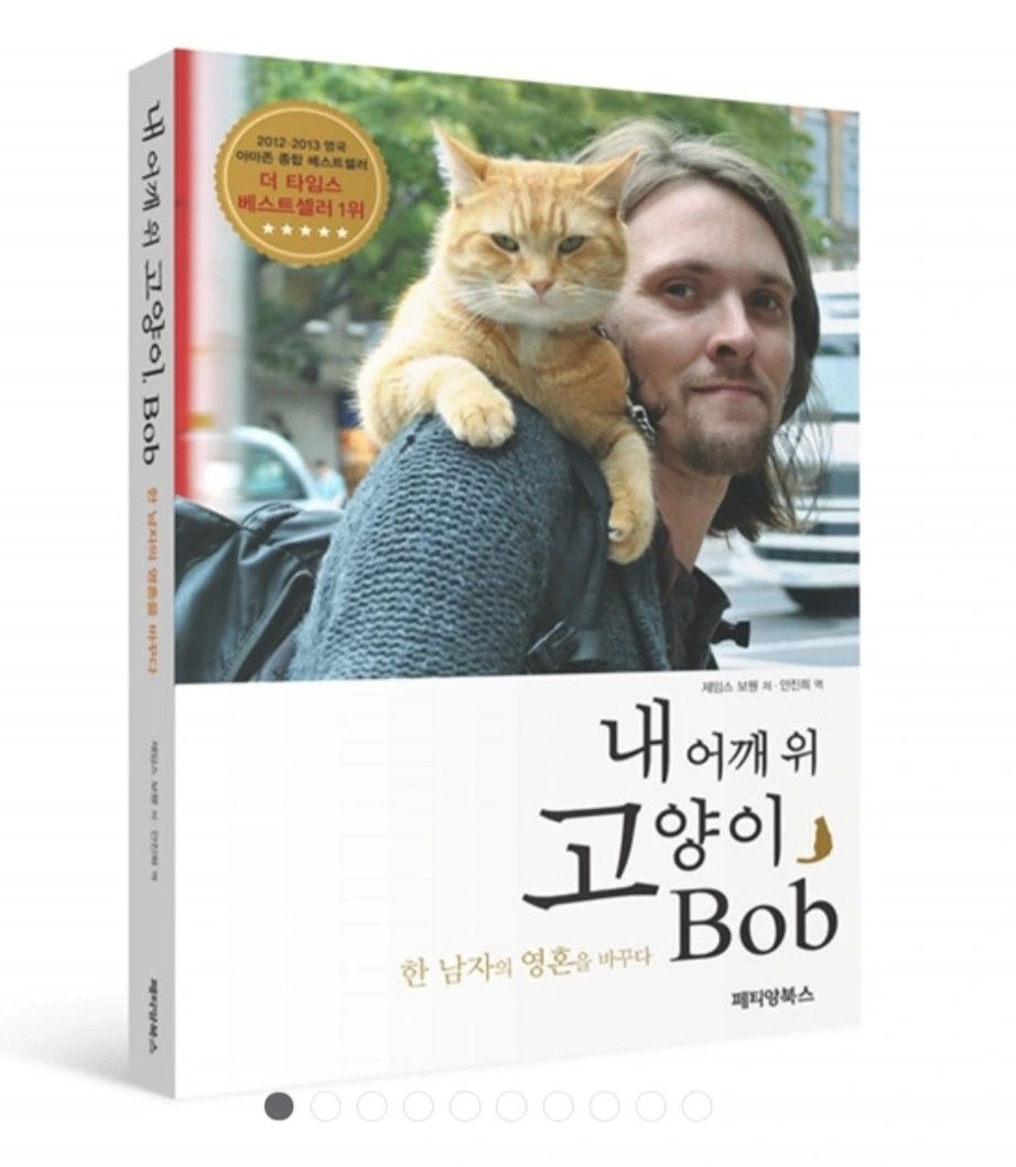 한국어 번역도 있다 / 실제 제임스가 출판회때 사인을 하자 의젓이 앉아있는 밥. 영화에 나오는 밥이 실제 밥이다.