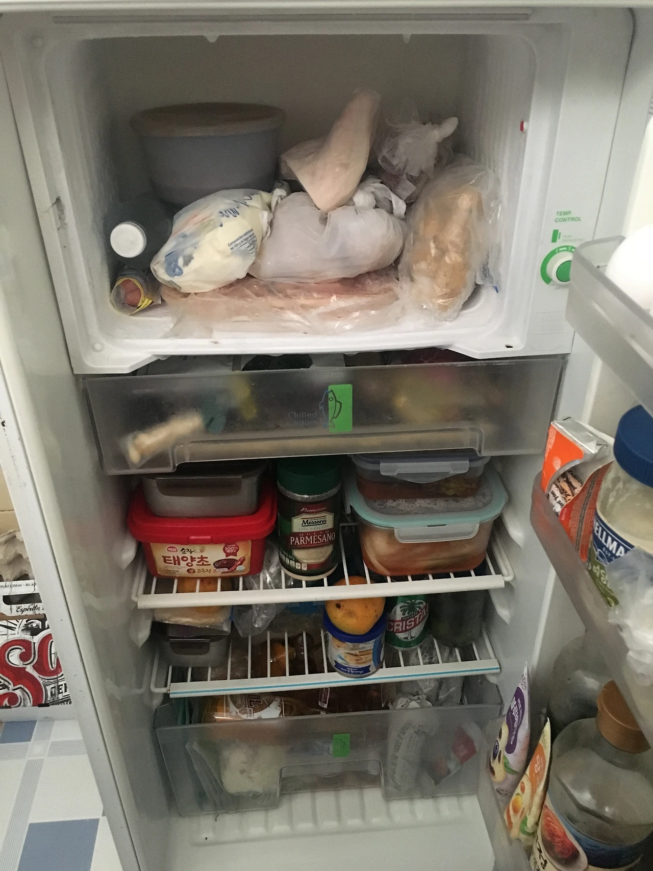 이 쪼그만 문 한 개짜리 냉장고는 냉동실 문은 어디다 떼다 팔았는지 아예 없는 데다 냉동실에 성애가 어찌나 빨리 자라는지 속도가 LTE를 능가한다. (인터넷 속도나 어떻게 좀...) 덕분에 매일 냉동실 물건들을 꺼내서 붙어있는 얼음을 제거하고 다시 넣는 게 거의 하루 일과 중 하나가 되어버렸다.