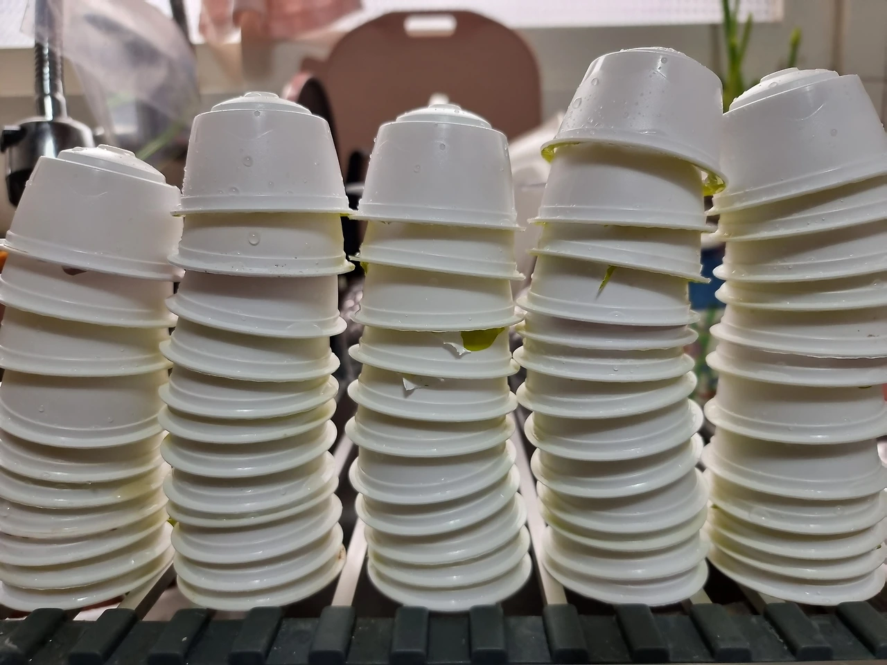 그때부터 커터기로 캡슐 뚜껑을 열고는 우유의 흔적을 제거한 후 깨끗이 씻어서 캡슐을 하나씩 쌓아갔다. 뚜껑으로 사용된 비닐은 비닐봉지에 모아두었다. 시간이 요하는 일이라 꽤 많은 시간이 소요되었다. 하얀색 우유 캡슐을 다 분리하고 나니 총 58개였다. 엄청났다. 이제 저 숫자만큼 커피 캡슐도 분리해야 하는데 커피 캡슐은 비닐도 2번 제거해야 하고 커피 찌꺼기도 따로 모아야 하니 시간이 더 걸릴 테다.