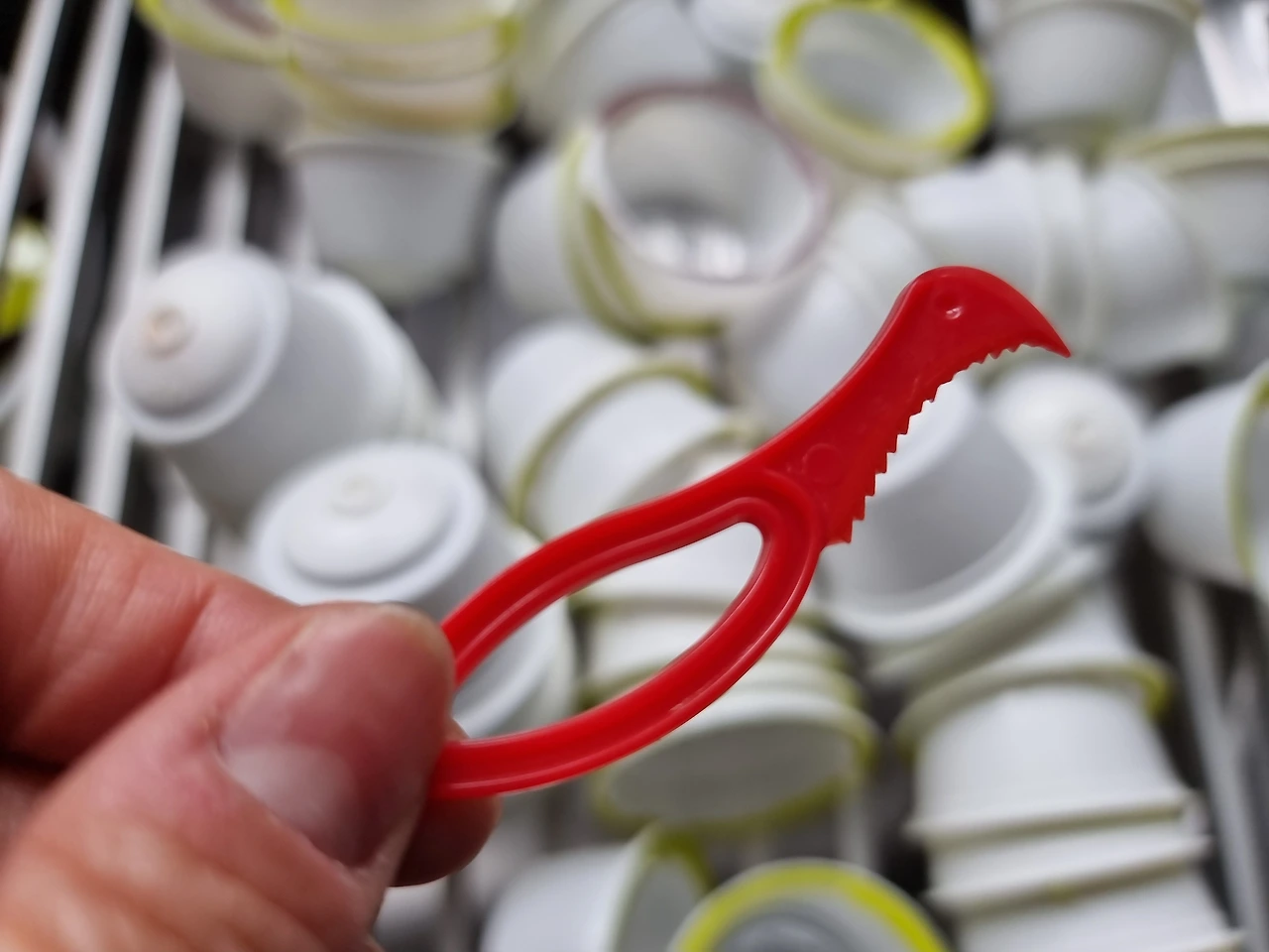 처음에는 캡슐이 많지 않아서 할 만하다고 생각했다. 그런데 처음 분리수거를 한 후로 귀찮아서 여기저기 캡슐들을 쌓아놓았더니 더 이상 쌓아둘 데가 없어서 오늘 아침에 집 청소를 하고는 큰 마음을 먹고 캡슐을 분리하기 시작했다. 일단 하얀색 우유 캡슐부터 시작했다. 캡슐 비닐 제거부터가 쉽지 않았다. 부엌칼로 해 보았더니 잘 안 되었다. 게다가 손 다칠 위험도 있으니 안 되겠다 싶어 포장 떡볶이를 사면서 받았던 플라스틱 커터기로 열어보았다. 잘 열렸다.