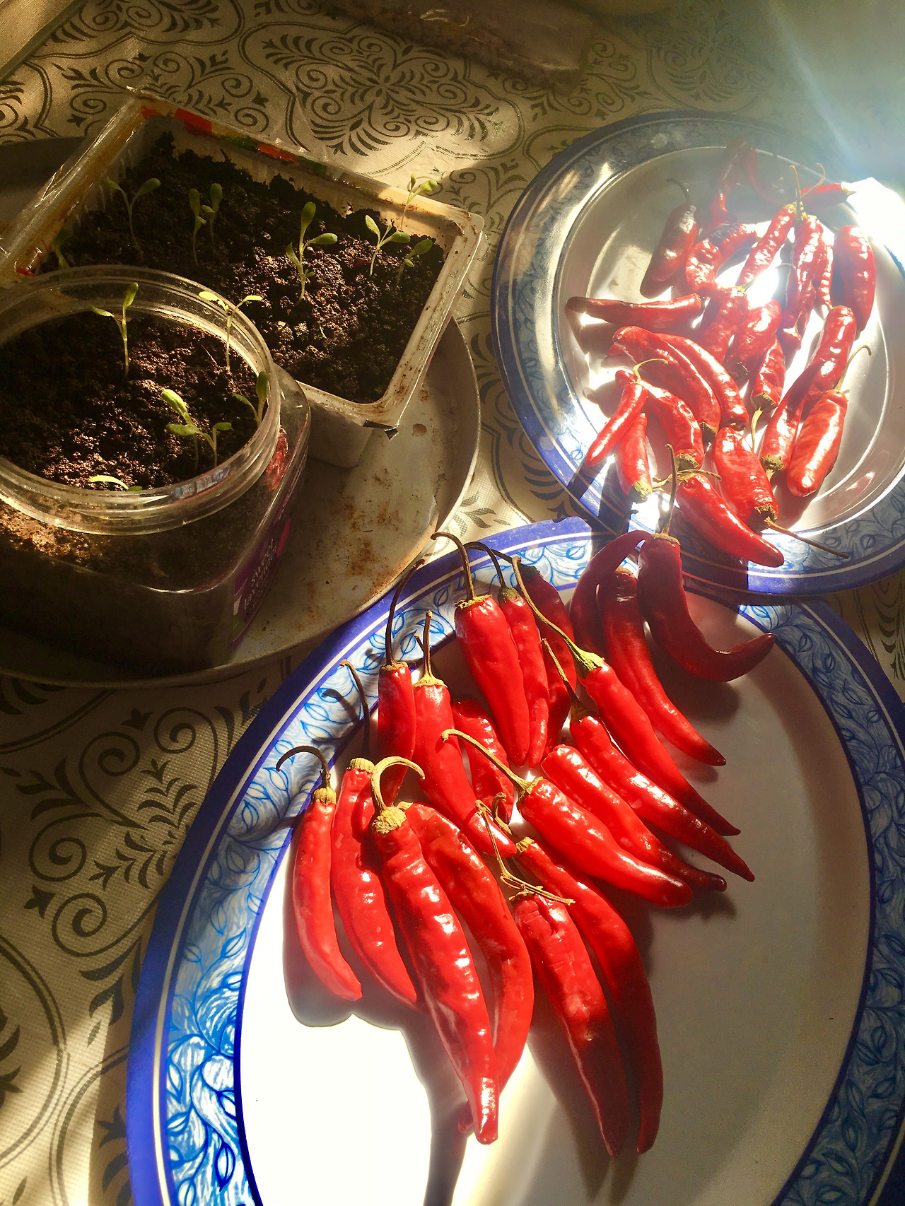 시골에 가면 할머니들이 집 앞이나 길거리에 새빨간 고추들을 쭉 깔아놓고 말리는 걸 많이 봤었다. 그래서 나도 그렇게 해 보기로 했다. 접시 두 개에 고추를 겹치지 않게 나눠 담고 햇빛이 비치는 곳에 두었다. 해가 다른 쪽으로 들어오면 그쪽으로 접시를 옮겼다. 매일 접시를 여기 뒀다 저기 놓았다 하며 고추를 말린 지 보름이 지났다.