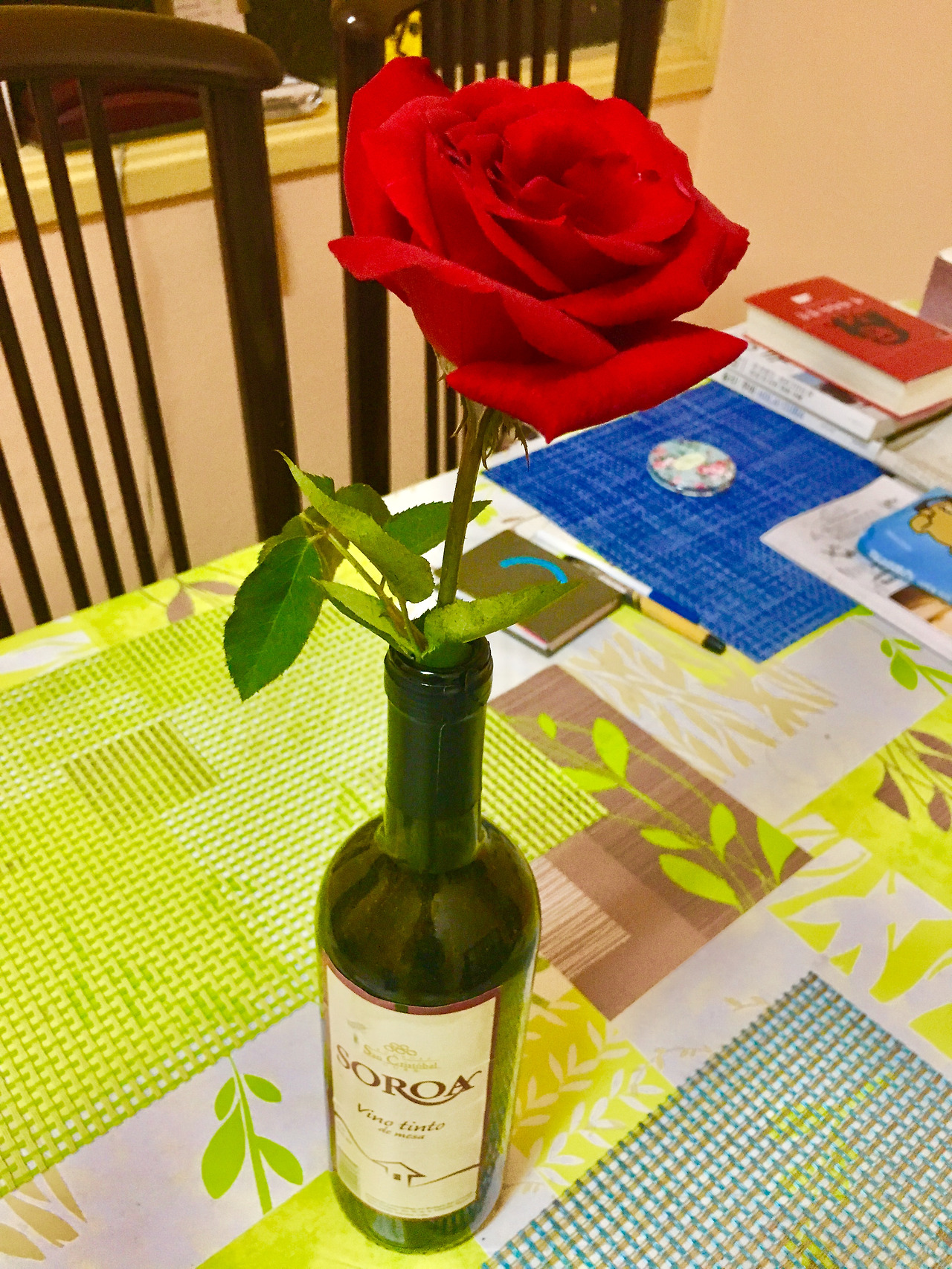 화장대를 보니 또 다른 와인 병에 어여쁜 새빨간 장미가 꽂혀 있었다.