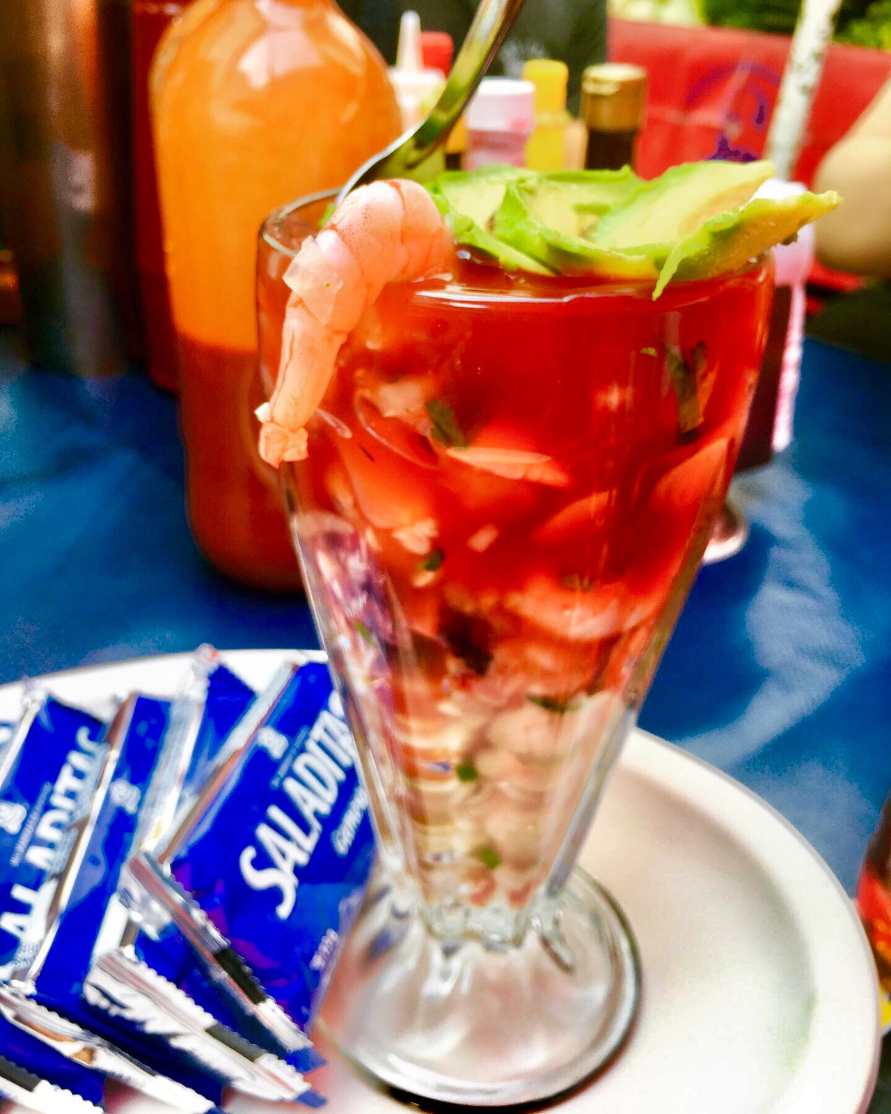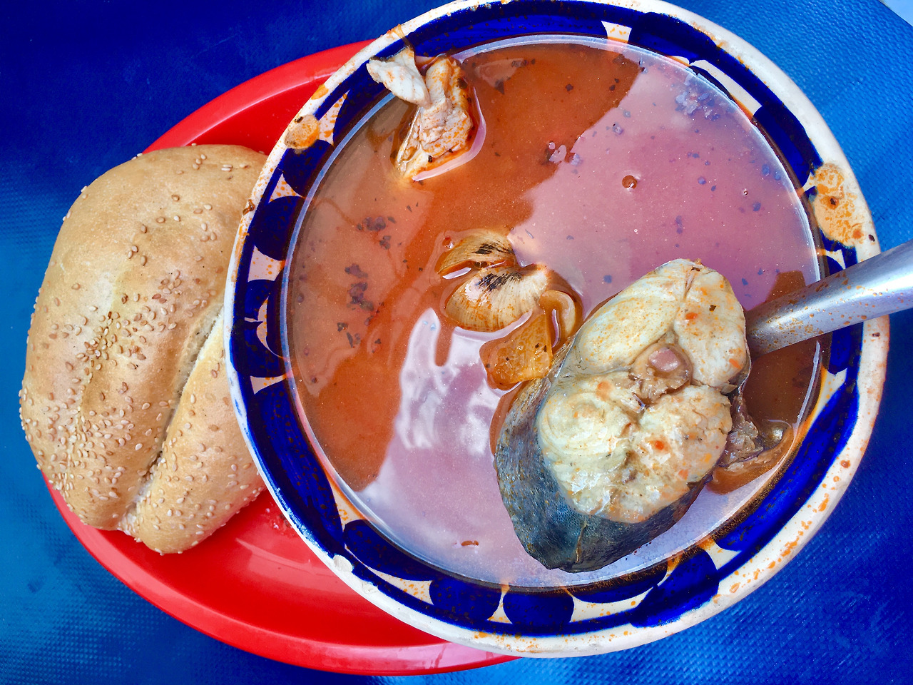 맨 먼저 새우 옆에 아보카도가 예쁘게 자리를 잡고 있는 칵테일 새우가 그 자태를 드러내었다. 6명이라 2개를 시켰더니 양이 꽤 많았다. 유리잔 속 깊이까지 새우가 가득 차 있었던 것이었다. 눈속임 따위는 눈곱만큼도 없었다. 칵테일 새우에는 크래커가 함께 나오는 데 크래커에 새우와 그 식당만의 특제 소스를 올려서 먹으니 꿀 맛이었다. 곧이어 깔도라고 하는 시뻘건 생선 수프가 나왔다. 동태(?) 한 덩이가 들어간 게 마치 한국의 해장국처럼 얼큰해 보였다.