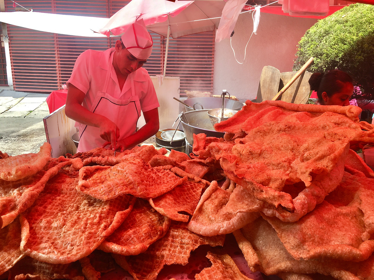 분명 아침을 든든히 먹었는데 또 우리의 눈길을 끄는 게 하나 있었으니, 치차론이라 불리는 돼지 껍데기 튀김이었다. 쿠바에서는 돼지 껍데기를 붙어있는 비계와 같이 튀겨서 소금을 뿌려서 먹는데 멕시코에서는 돼지 껍데기를 얇게 펴서 튀긴 다음 과자처럼 만들어서 팔았다. 한국에서는 돼지 껍데기 구이도 잘 못 먹었던 내가 쿠바에서는 그게 왜 그렇게 고소하고 맛난 지 잘도 먹었다.(치차론은 남편 담당) 그래서 멕시코 돼지 껍데기 과자도 그냥 지나칠 수가 없었다. 시식하라고 주는 걸 먹어보니 바삭바삭 아주 맛났다. 술안주로 딱인 맛이었다. 그래서 한잔 할 때 먹으려고 한 봉지를 샀다.