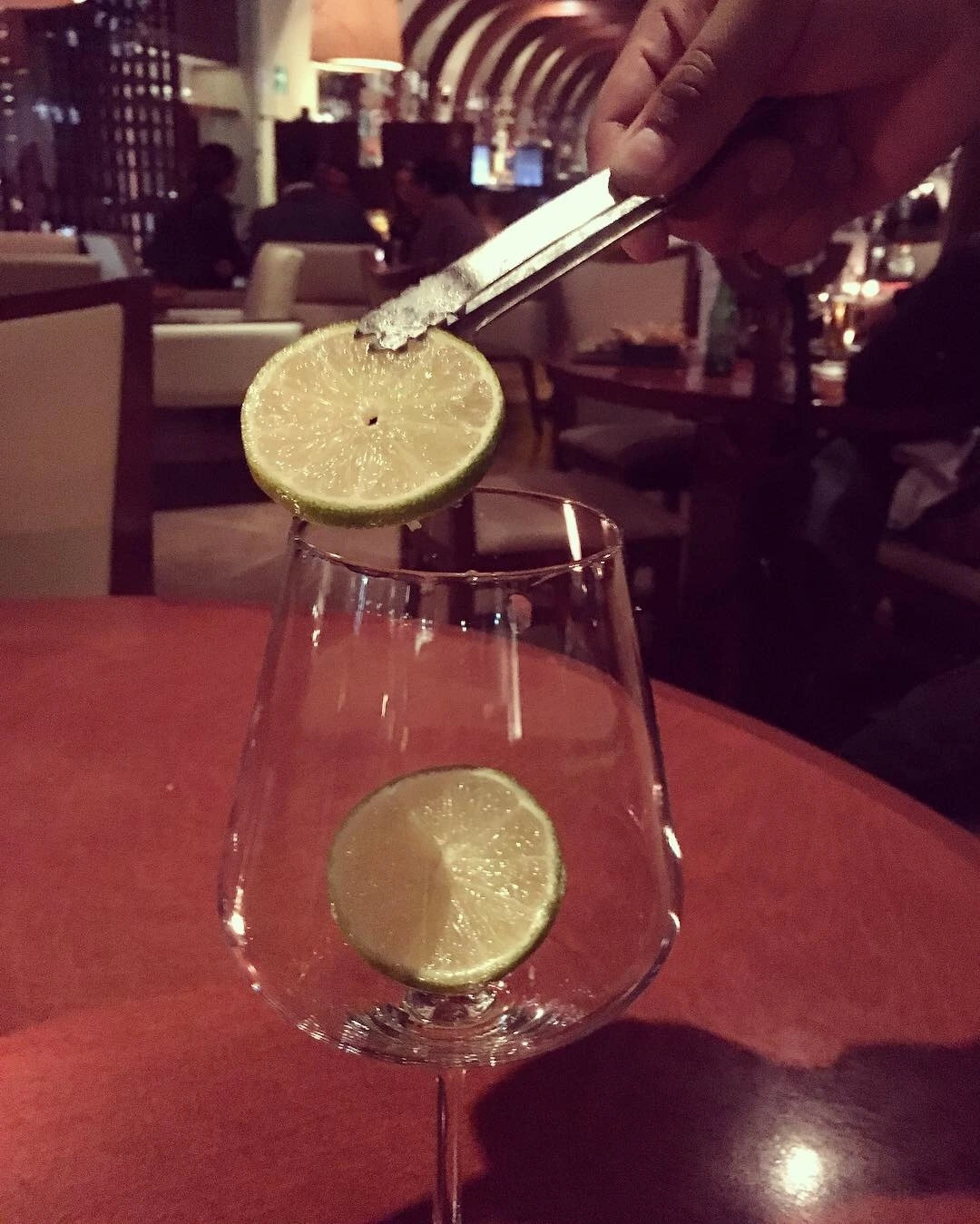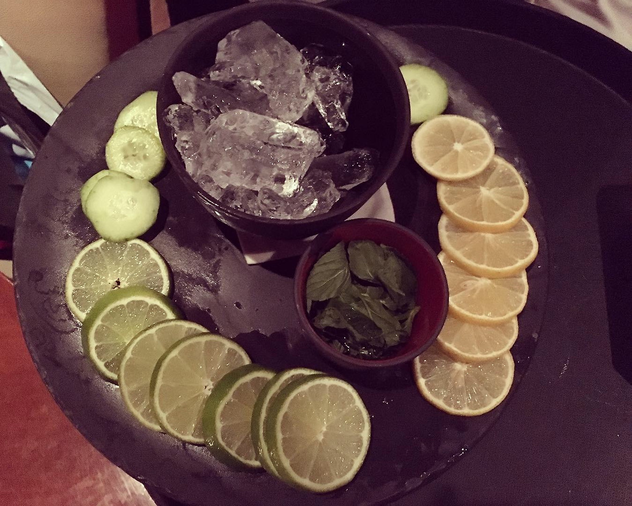 혼자인데도 편안하고 넓은 자리로 안내해 주었다. 가방을 들어주었던 총지배인인지 매니저인지 모르는 그 신사는 좋은 시간을 가지라고 하며 물러갔고 다른 직원이 와서 “환영합니다!”라고 인사를 하며 메뉴판을 주었다. 곧이어 또 다른 직원이 물을 가지고 왔다. 그런데 그냥 물이 아니었다. 레몬, 라임, 오이, 바질 잎사귀 그리고 얼음이 든 쟁반도 함께 가져와서는 보여주며 어떤 물을 원하냐고 물어보았다. 나는 “어떤 물이냐구요? 와우! 이런 거 첨 봐요. 사진 하나 찍어도 돼요?” 하면서 사진을 찍고는 라임으로 요청을 했다. 그랬더니 핀셋으로 라임을 들어서 물 잔의 입 대는 곳을 한번 쓱 문지르고는 잔 안에 라임을 넣었다. 그 장면 하나하나가 나에게는 너무 신기했다. 물 한잔에 저리도 선택권이 많다니!