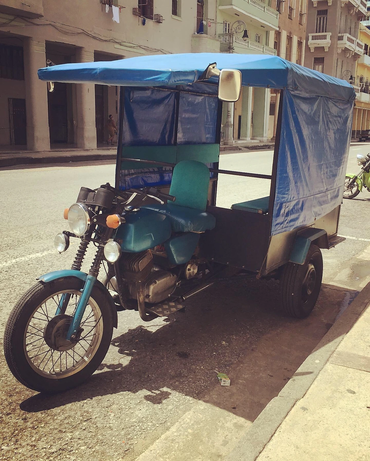 잠시 후에 택시 기사님이 도착하셨다. 마차같이 생긴 이 교통수단은 오토바이를 변형해서 만든 택시였다. 짐 옮길 때 아주 안성맞춤이었다. 자동차 가격이 아주 비싼(소나타 중고가 육칠 천만 원, 새 차는 일억 정도가 된다고 들었다. 올드카는 사천만 원 정도면 구입을 하는데 수리가 장난이 아니어서 사는 순간 골칫덩어리가 되어 버린다) 쿠바에서는 오토바이 택시, 자전거 택시를 비롯해 특이한 교통수단이 다양하게 있어 그것들 보는 재미, 타는 재미도 쏠쏠하다.