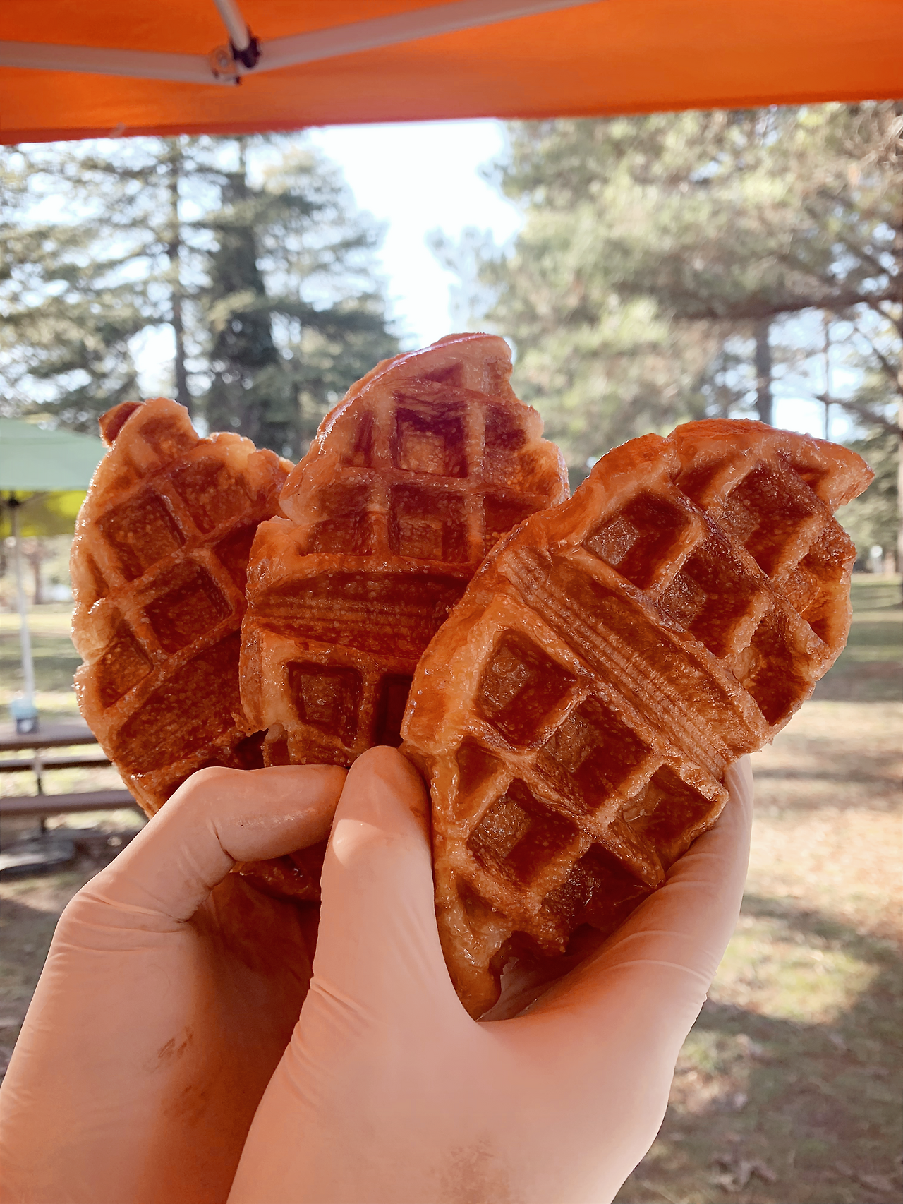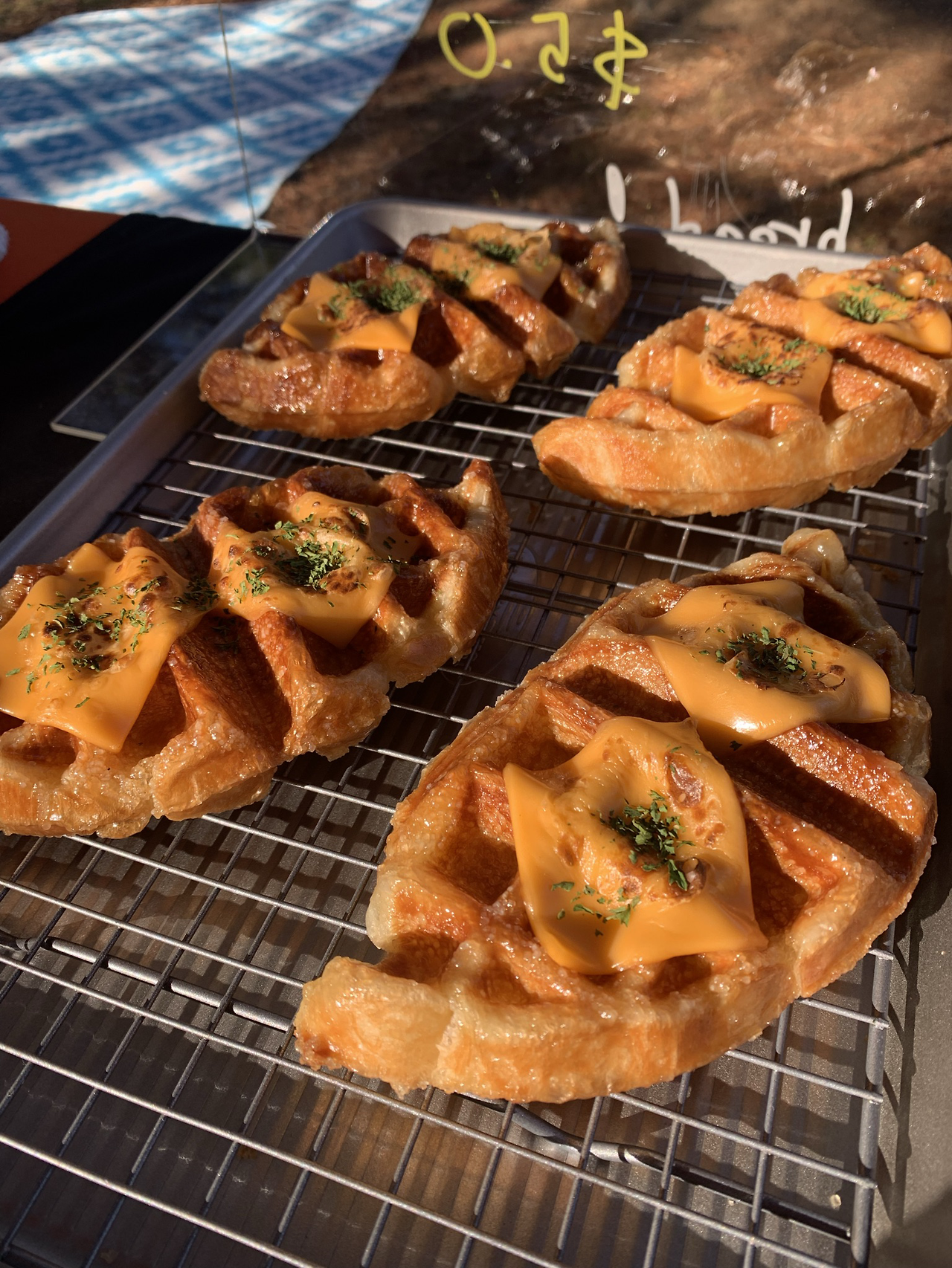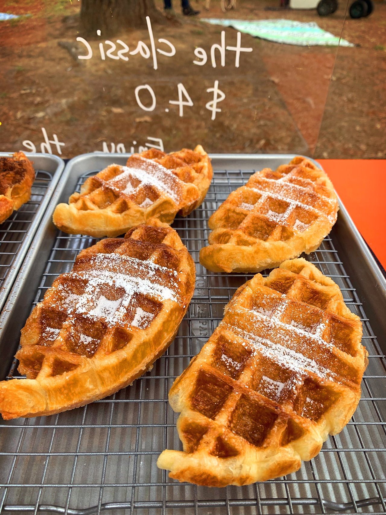 전날 밤 비 오는 소리를 들었는데 다행히 비는 그쳐있었다. 마켓에 가보니 바닥이 비로 인해 진흙 져있었다. 이왕이면 뽀송뽀송한 잔디였으면 좋았겠지만 일단 비는 그쳤으니 이것도 감지덕지지 하는 생각으로 가게를 열었다. 이제 몇 번 해봤다고 진흙탕 위에서도 수월하게 천막을 치고 오픈준비를 끝마쳤다. 순조롭게 가게를 오픈하고 와플팬에 빵을 굽기 시작하니 왠지 좋은 예감이 들었다.