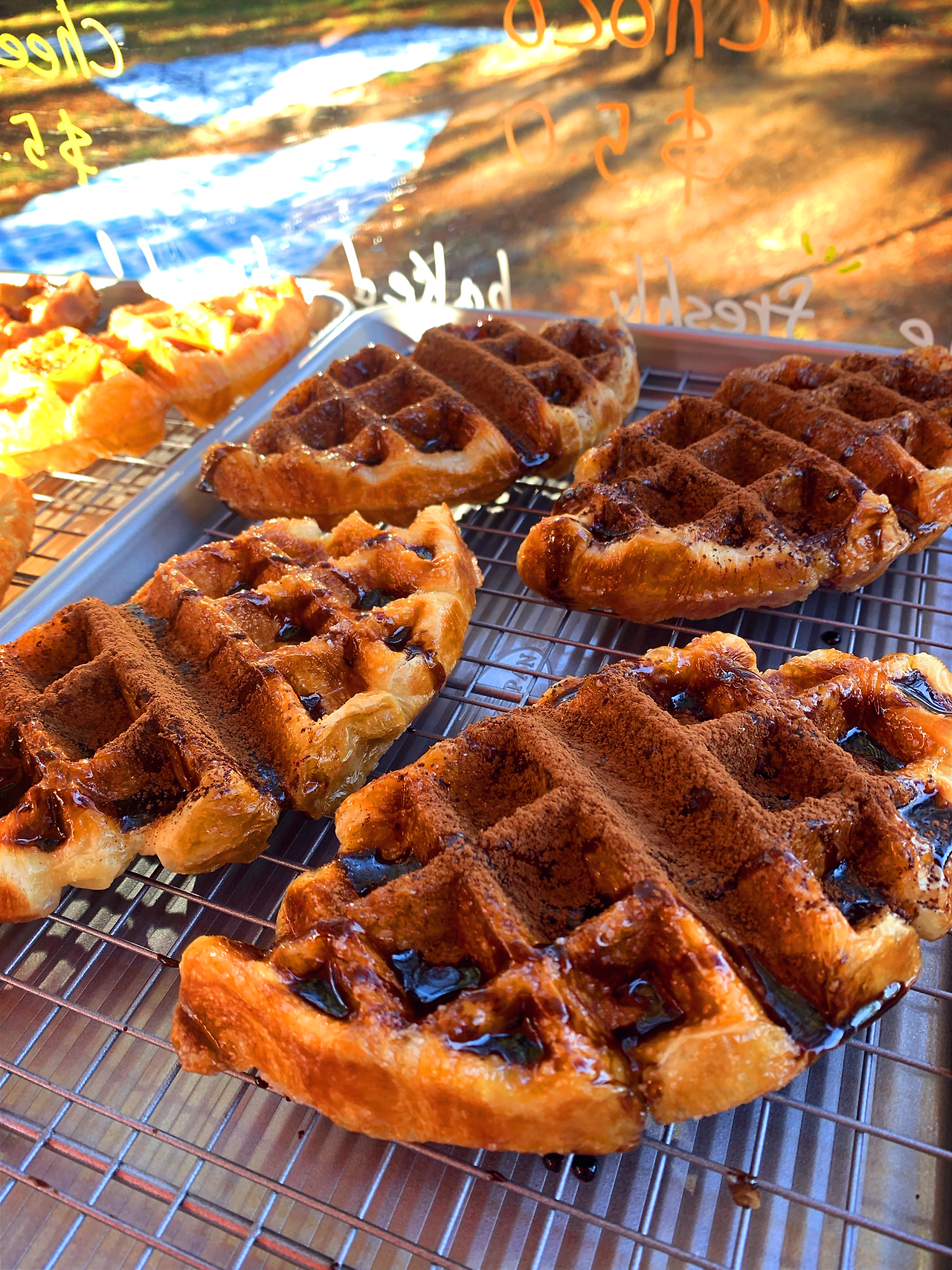 지나가는 사람들에게 인사를 하며 특히 커피를 든 사람과는 기필코 아이컨택을 한 후 “웰컴 투 크로플”을 외쳤다. 열에 일곱 정도는 우리가 무엇을 팔고 있는지 관심을 보였다. 그중 둘셋 정도는 크로플이 흥미로운 조합이라며 시도해 보고 싶다고 지갑을 열었다. 날개 돋친 듯 팔리는 속도는 아니었지만 그래도 하나 둘 꾸준히 빵이 팔렸다. 한참을 손님들과 얘기하다가 옆을 돌아보니 벌써 재료 한 통이 비어있었다.