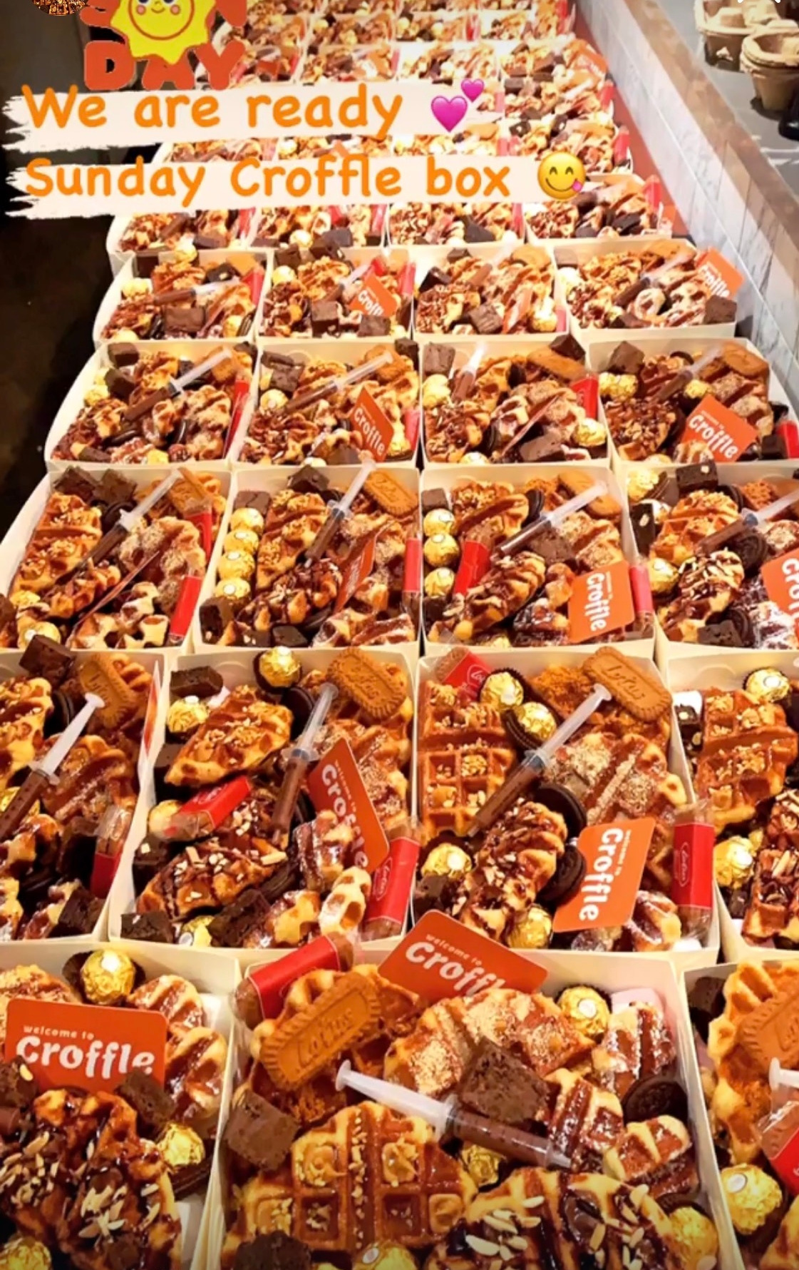 그렇게 잠깐의 소동을 뒤로하고 다시 밤새 빵을 굽고 포장했다. 밤 9시부터 시작했는데 아침 7시가 다 되어서야 겨우 물량을 맞출 수 있었다. 우리의 크로플 박스에는 카야, 비스코프, 누텔라, 피넛버터 총 4가지와 미니 클래식 크로플 3개, 그리고 직접 구운 브라우니와 페레로로쉐, 초코주사기, 과자가 같이 들어갔다. 굽는 것도 일이지만 포장하는 것도 예상보다 오랜 시간이 걸렸다.