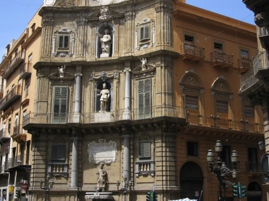 우리는 먼저 시장부터 둘러본다. 시장만큼 푸근하고 긴장 풀기에 좋은 곳이 또 있을까? 오후 시간대라서 그런지 사람들도 많지 않다. 발라로 시장은 부치리아(Vucciria) 시장과 쌍벽을 이루는 시장답게 규모가 크고 넓다. 시장 골목을 겨우 빠져나오자 사거리 하나가 나온다. 사거리 모퉁이 한쪽에 한 무리의 관광객들이 가이드의 설명을 열심히 듣고 있다. 콰트로 칸티(Quatro Canti, 사거리의 뜻)이다. 콰트로 칸티는 팔레르모 구시가지 관광의 기점이다. 서울로 치면 광화문 사거리이다. 이곳을 중심으로 비토리오 에마누엘레 거리와 마케다 거리가 교차된다. 대부분의 볼거리들은 이 부근에 다 있다. 콰트로 칸타 코너의 3층 건물들 파사드에는 사계절과 스페인 왕, 그리고 팔레르모의 수호신들을 조각한 바로크 조각상들이 내려다보고 있다.