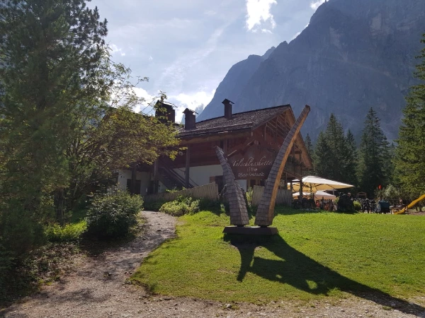 피스칼리나 계곡(Val Fiscalina ) 입구에서부터 V 자 계곡의 절경이 펼쳐진다. 마침 오늘은 일요일이라 많은 하이커들이 가벼운 차림으로 이 길을 걷고 있다. 길은 깊은 계곡 사이로 평탄하게 이어진다. 아내는 챙겨 온 스틱에 의지하며 천천히 걷는데 길이 어렵지 않아 신바람이 나서 잘도 걷는다. 날씨는 점점 더워지고 하늘에 가끔씩 구름이 걸리기도 하지만 걷기에는 더없이 좋은 날씨이다. 걷다가 길가 벤치에 앉아 간식을 먹기도 하며 쉬엄쉬엄 1시간쯤 걸으니 마침내 오늘의 목적지 폰도 발레(Fondo Valle) 산장이 나타난다. 산장 주변은 얼마 남지 않은 늦여름의 주말을 즐기려는 사람들로 가득하다
