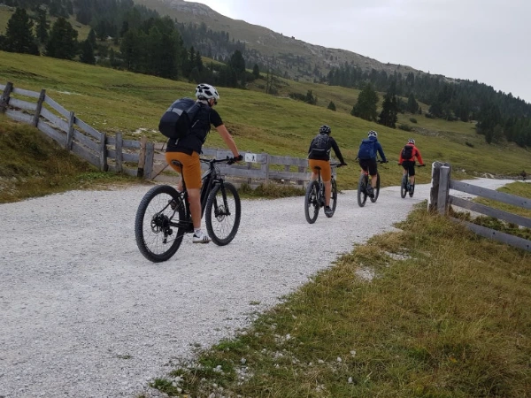 나는 스페치에 산 조망대에 올라가 보고 싶지만 날씨도 흐린 데다 아내가 그곳까지 올라가기는 사실상 어려워 포기하고 우리는 피아짜 평원을 내려다보며 발란드로 산장(Rifugio Valandro)까지 걷기로 한다. 날씨는 흐리지만 걷기에는 딱 좋은 날씨이다. 피아짜 평원에서는 발란드로 산장까지 1시간 정도 걸으면서 내려다보는 넓고 푸른 초원의 풍광이 압권이다. 시원하고 가슴이 탁 트이는 기분이다. 길도 평탄한 마사토 길로 이어져 굳이 스틱도 필요 없다. 지나가는 자전거 라이더들의 모습도 상쾌해 보인다.