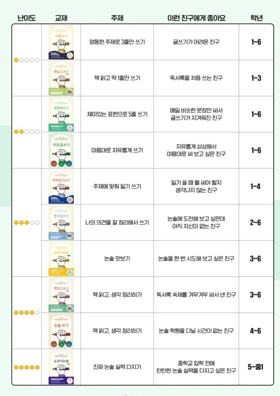 우리집은 이 교재 중에서 하나씩 아이가 골라서 주1회 꾸준히 하는 중이다. 현재 초5는 논술쓰기, 초3은 생각글쓰기를 하고 있다.