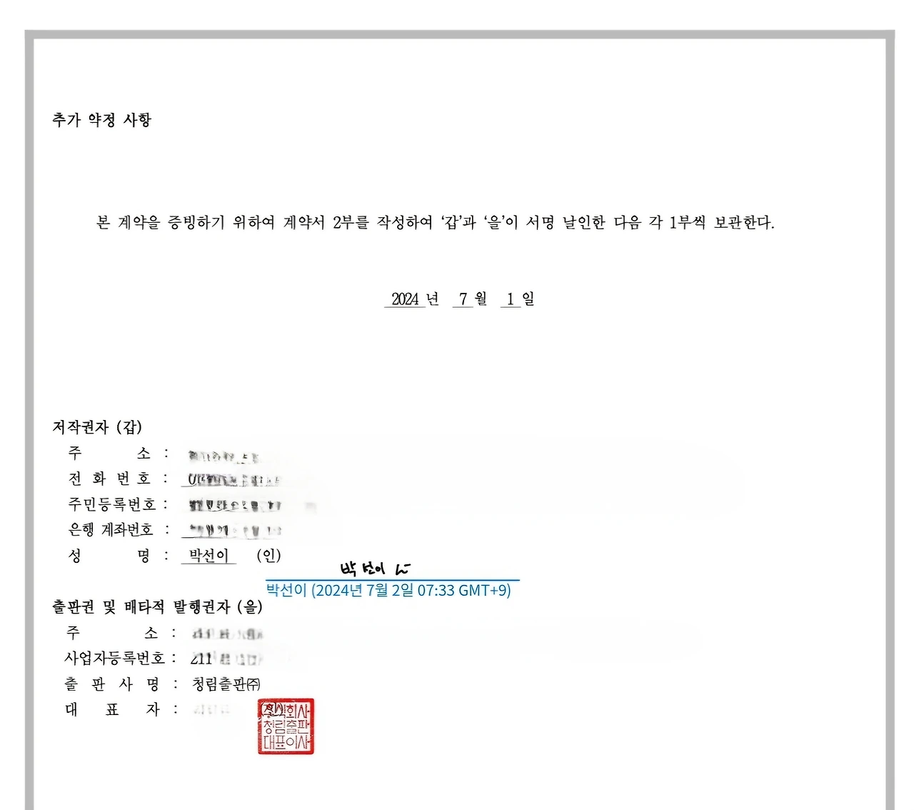 그리고 빈칸에 이름을 넣고, 계좌번호를 적고, 살짝 떨리는 손끝으로 마지막 페이지까지 스크롤을 내려 사인을 했다.