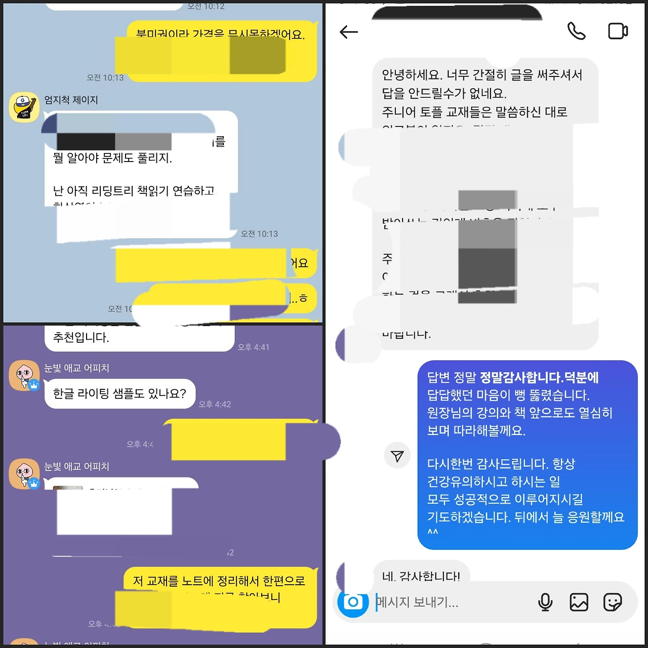 대략적인 로드맵이 그려지면서 조금씩 모르겠는 부분이 생겼다. 예를 들면 리딩과 라이팅의 수준 차이라던지, 처음 글쓰기를 할 때 어디까지 봐줘야 하는지, 어느 부분을 집중해서 봐주어야 하는지 구체적인 티칭법이 필요했다. 어떻게 이 문제를 해결할지 고민에 빠졌다. 10년 넘게 연락을 안 했지만 인친으로 되어있는 영어교사들에게 SOS를 칠 것인가, 나는 늘 책과 강의서 봐왔지만 누구보다 바쁜 전문가들에게 염치 불고하고 DM을 보낼 것인가, 요즘 내가 푹 빠져있는 브런치 모임에 영어강사가 있던데 그분들에게 민망하게 개인톡을 보낼 것인가. 나는 소심하고 부끄럼 많은 내향적인 사람이지만, 엄마는 적극적이고 창피함 따윈 없는 열정 넘치는 사람이니까 고민했던 방법을 모두 동원하기로 했다. 모두가 답변해 줄 거라 기대를 하지 않지만, 누군가는 나의 절실함을 알고 손을 내밀어 주겠지. 그나마 직접 얼굴을 보고 이야기를 나누는 게 아니라서 얼마나 다행인지 모른다.