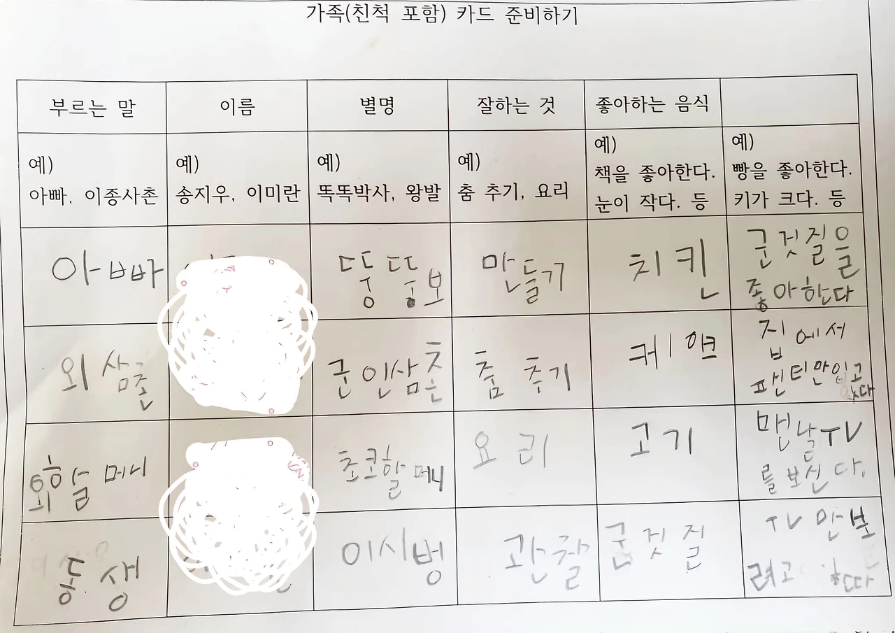남편은 종이를 패댕이치듯이 나에게 넘겨준다. 종이에는 표에 호칭, 별명, 잘하는 것, 좋아하는 음식과 특징을 가족과 친척의 이름을 넣어 완성할 수 있도록 표가 그려져 있었다. 아빠바라기라 예상대로 첫 번째에는 아빠가 적혀있다. 아빠의 별명은 갑자기 급조한 '뚱뚱보'. 평소 1호에게 '뚱돼지'라고 그렇게 놀리더니 오늘 제대로 당했다. 좋아하는 음식 '치킨' 그리고 특징에 '군것질을 좋아한다.' 너무 사실적으로 적어 읽는 내내 민망하기까지 하다. 다음은 누굴까? 서서히 두려워지기 시작해 일단 이름들부터 확인을 하고 내 이름이 없다는 걸 알고 나서야 마음 편히 다음 사람의 별명과 특징을 읽는다.