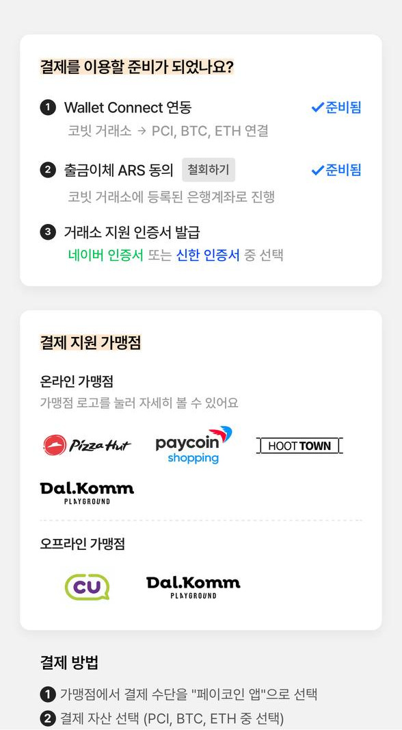 페이코인 앱 안에서 이뤄지는 방식이 아니라 '코빗'에서 매도 및 출금을 거쳐 결제가 이뤄지는 방식으로 바뀐 것이다. 즉, 금융당국이 문제 삼던 ‘직접 결제 구조’를 우회하면서도 실생활 결제가 가능해진 셈이다. 특히 결제 시 코빗에서 실시간 매도 후 실명계좌 출금 방식으로 진행되어 비트코인(BTC), 이더리움(ETH), 페이코인(PCI) 등 다수의 가상자산이 지원된다.