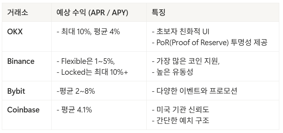 이렇듯 스테이블코인을 보유한 뒤 글로벌 거래소의 Earn 서비스에 예치하면, 정해진 이율에 따라 이자가 발생한다. 예를 들어, OKX Earn은 유연형·고정형 상품으로 1~6% 수익을 제공하고, Binance Earn은 기간별 락업 상품으로 최대 10% 이상도 가능하다. Coinbase는 USDC 보유만으로 연 4% 이상을 지급하며, Bybit은 이벤트형으로 8% 이상도 노릴 수 있다.
