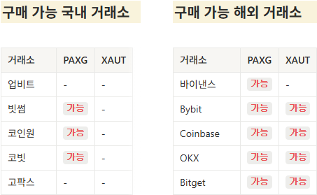 금 스테이블코인은 전통적인 금 거래소가 아닌 암호화폐 거래소를 통해 손쉽게 구매할 수 있다. 실물 금을 매수하듯 거래소에서 PAXG 또는 XAUT를 매수하면 된다. 국내에서는 빗썸·코인원·코빗에서 PAXG를 거래할 수 있다. 해외에서는 바이낸스, Bybit, Coinbase, OKX, Bitget 등 주요 거래소에서 PAXG와 XAUT를 대부분 지원한다. 국내와 해외 거래소에서 금 스테이블 코인 입출금 및 보유가 가능하다.