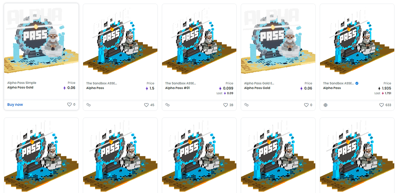 기업들이 구매한 랜드의 크기를 보면 마치 중세시대 영주들의 깃발이 꽃혀있는 영지 같은 느낌을 받는다. 일반인들이 구매한 랜드들은 보이지도 않지만 거대한 랜드를 보유하고 있는 호스트(Host)들의 랜드에는 기업 로고가 보인다. 미래의 더 샌드박스의 영주님들이다. 특정 랜드의 주인들은 자신의 랜드에 입장하는 것을 허락하는 조건으로 NFT화된 특정 아이템이나 입장권을 요구할지도 모른다. 아니 분명 그럴 것이다. 왜냐면 지금도 그러고 있으니까. 'Alpha Pass'를 가지고 있지 않다면 특정 콘텐츠를 즐길 수 없다. NFT를 구매하거나 당첨을 받아야한다. 가격은 960만원 정도로 거래되고 있다.