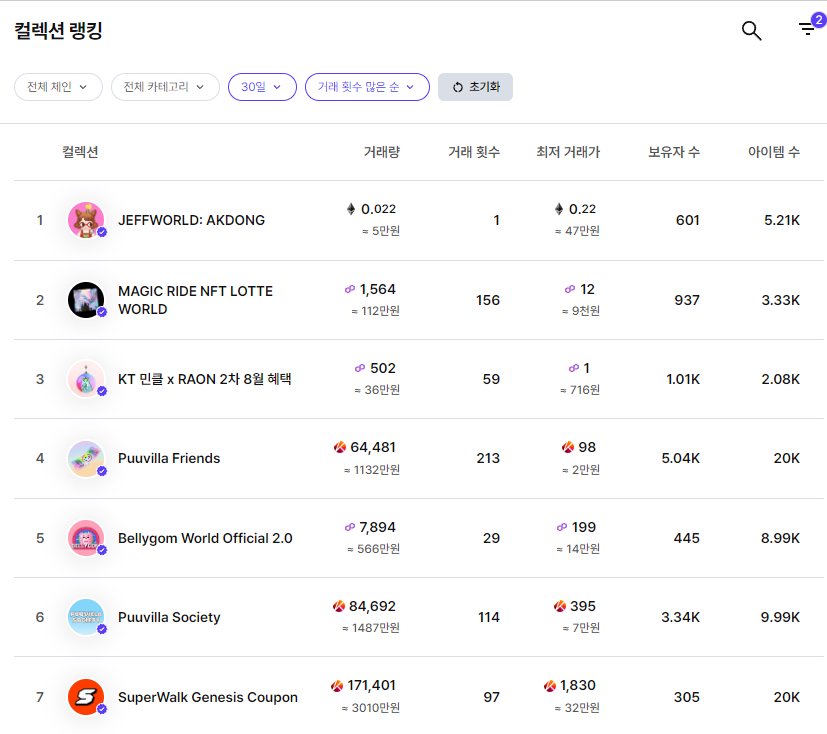 현재 팔라 컬렉션 랭킹 페이지에서 전체 체인(전체 암호화폐)로 기준으로 30일과 전체 기간으로 설정하면 횟수에 상관없이 노출되는 문제가 발생하고 있다. 전체 기간으로 설정 시 거래 횟수에 상관없이 이더리움이 우선으로 노출되고 있으며 30일 기준 같은 경우 어떤 기준으로 정렬되고 있는지 알 수 없을 정도였다. 이 부분은 팔라 측에서 개선이 필요한 부분이라고 생각한다.