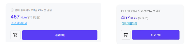 NFT도 상품이기 때문에 그 상품을 직관적으로 표기하는 것은 중요하다. 하지만 암호화폐 시세를 매일 확인하지 않는 사람들이라면 NFT 가치를 바로 알아차리기 어렵다. 그렇기 때문에 가격을 달러로 표기하기보다 원화로 표기로 통일하는 것이 적합하다.