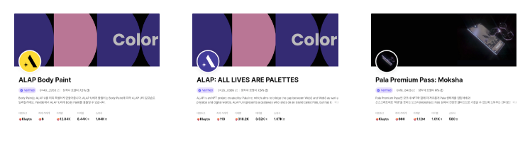최근 국내 유명 기업에서 발행한 대부분의 NFT는 팔라 사이트에서 판매되었다. 팔라는 신뢰할 수 있는 기업들의 NFT를 판매하여, 기업들의 NFT가 팔라에서 2차 거래되도록 자연스럽게 유도하였다. 또한, 기업들은 불필요한 페이지 구축 비용을 절약하고 팔라를 통해 자신들의 NFT를 판매할 수 있어 상호 협력적인 관계를 맺을 수 있었다.