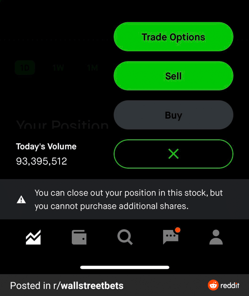 레딧에 제보된 로빈후드의 스크린샷. 게임스탑 주식 구매 버튼이 비활성화되어있다.