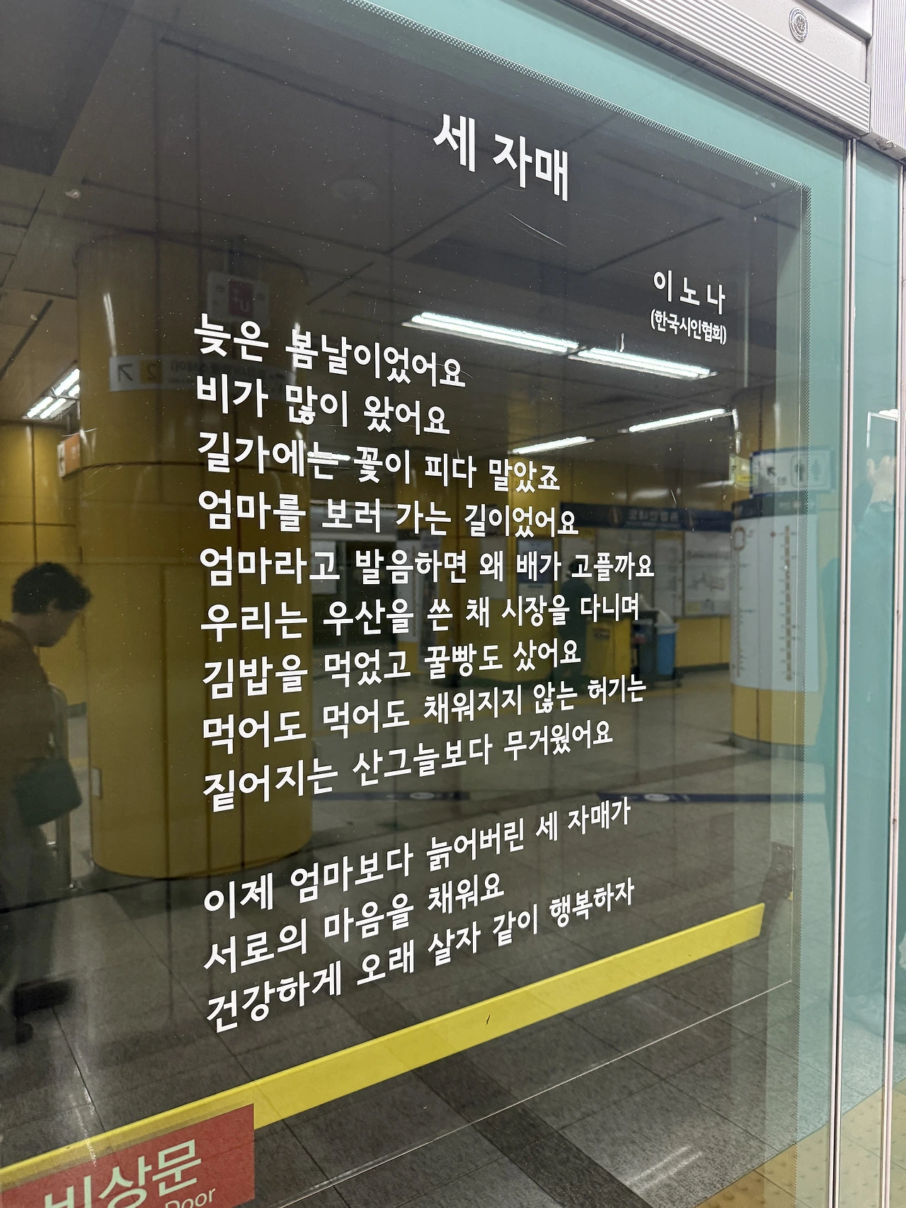 그렇게 우두커니 혹은 뚜벅뚜벅 걷다가 지하철역에서 시를 만났다. ‘엄마보다 늙어버린 세 자매’ 시구에 문득 난 엄마보다 더 살 수 있을까-.