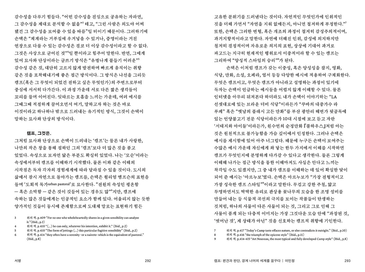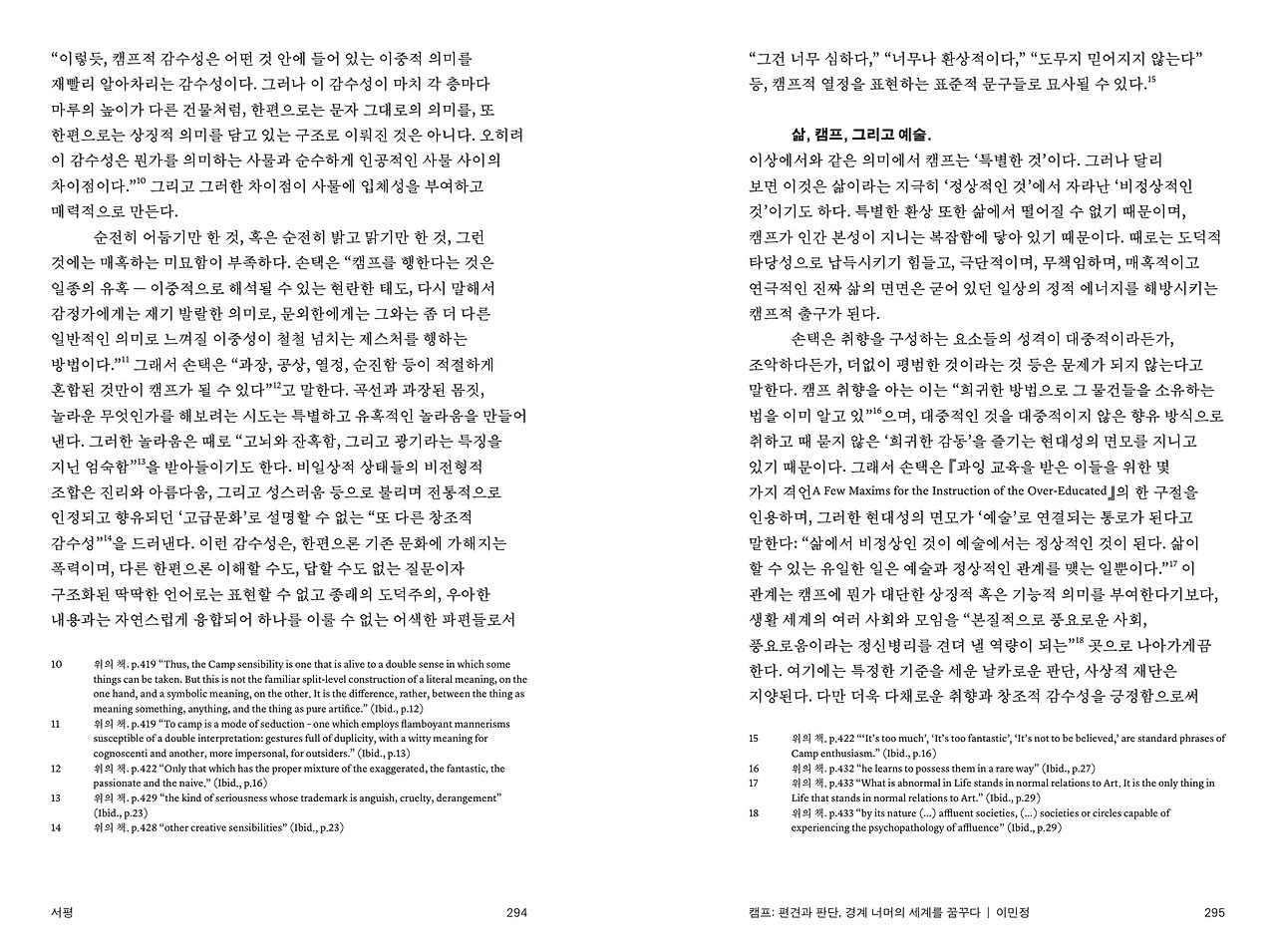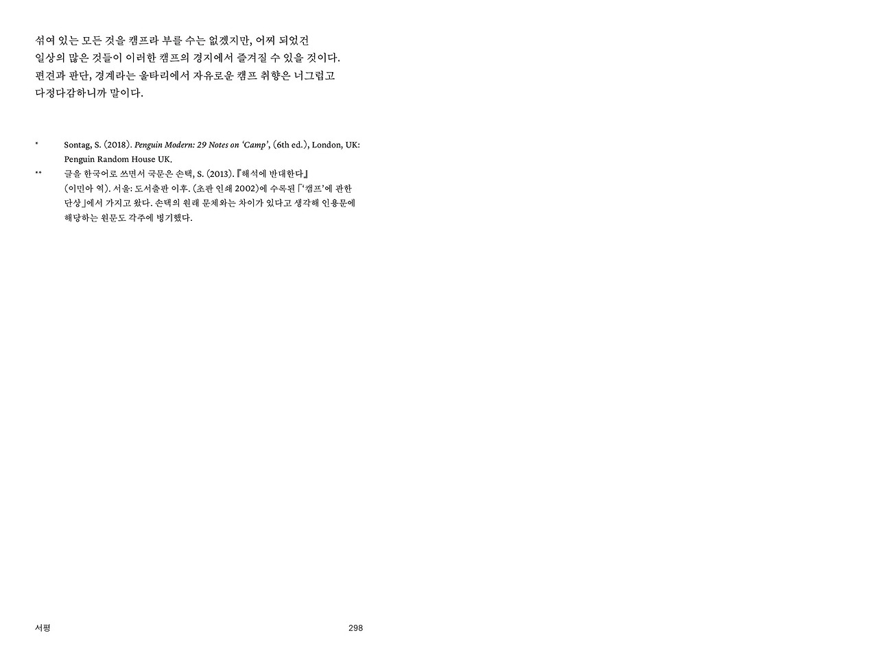 글을 한국어로 쓰면서 국문은 손택, S. (2013). 해석에 반대한다 (이민아 역). 서울: 도서출판 이후. (초판 인쇄 2002)에 수록된 「‘캠프’에 관한 단상」에서 가지고 왔다. 손택의 원래 문체와는 차이가 있다고 생각해 인용문에 해당하는 원문도 각주에 병기했다.
