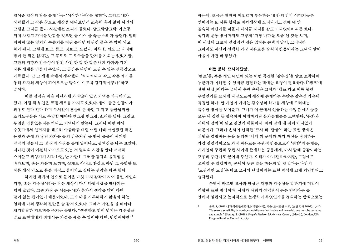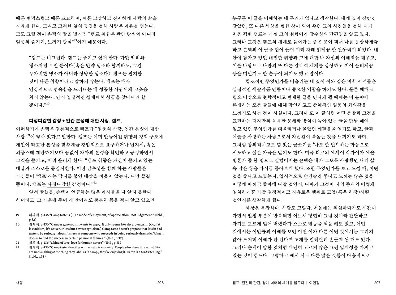 ‘캠프’에 관심을 가지게 된 것은 순전히 그 때문이었다. 많은 사람들이 구체적으로 뭐라 정확하게 표현하기는 힘들다는 데에 동의한 현대 대중문화 용어로서, 혹은 미학 용어로서 캠프는 “과시적이고, 과장되어 있으며, 인위적이고, 연극적인, 혹은 지나치게 여성적이거나 동성애적인” 분위기를 가지는 어떤 것을 지칭한다고 알려져 있다. 하지만 평범한 일상을 살아가는 나에겐 그렇지 않았다. 내게 캠프란 흔히 가족끼리, 때론 연인 혹은 지인들끼리 모여 가곤 하는 취미생활로서의 야영, 바로 그것에 더도 덜도 아니었다. 그러나 어떤 개념이든 그것의 의미를 부풀려보기 위해서는 확실한 이해의 시작점이 필요하다. 그런 의미에서 그가 경험하게 해 준 캠프는 내가 손택의 캠프로 나아가는 데 있어 작지만 확고한 하나의 발판이 되어주었다.
