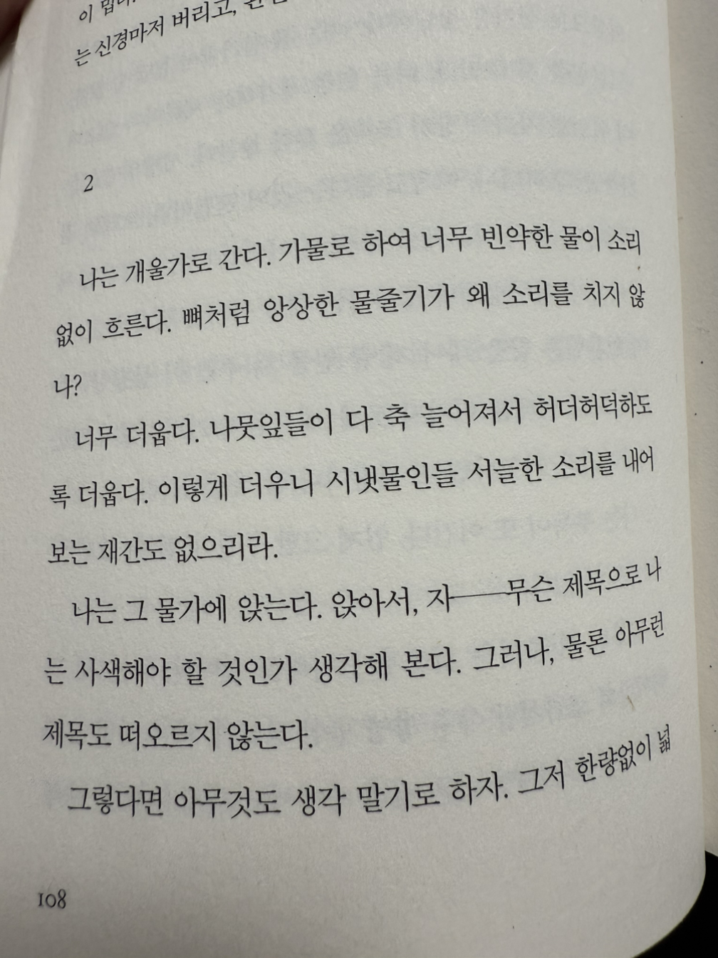 나는 그 물가에 앉는다. 앉아서, 자무슨 제목으로 나는 사색해야 할 것인가 생각해 본다. 그러나, 물론 아무런 제목도 떠오르지 않는다.