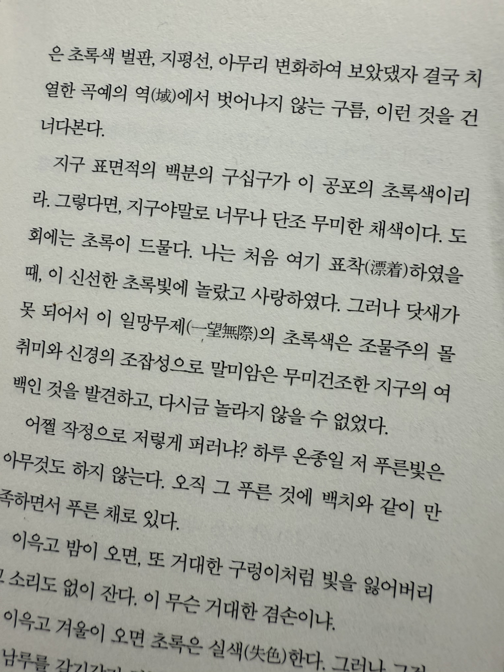 지구 표면적의 백분의 구십구가 이 공포의 초록색이리라. 그렇다면, 지구야말로 너무나 단조 무미한 채색이다. 도회에는 초록이 드물다. 나는 처음 여기 표착(漂着)하였을 때, 이 신선한 초록빛에 놀랐고 사랑하였다. 그러나 닷새가 못 되어서 이 일망무제(一望無際)의 초록색은 조물주의 몰취미와 신경의 조잡성으로 말미암은 무미건조한 지구의 여백인 것을 발견하고, 다시금 놀라지 않을 수 없었다.