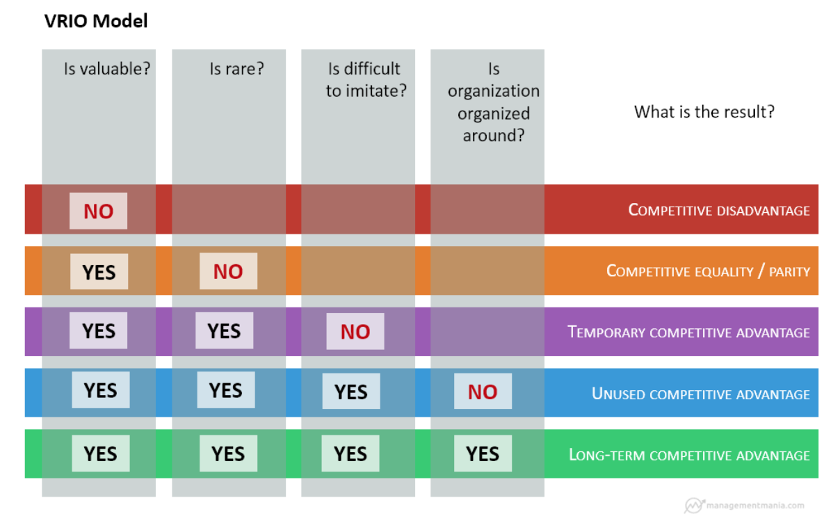VRIO 분석을 통해 기업의 특정 자원이나 능력을 다음과 같이 평가할 수 있다.