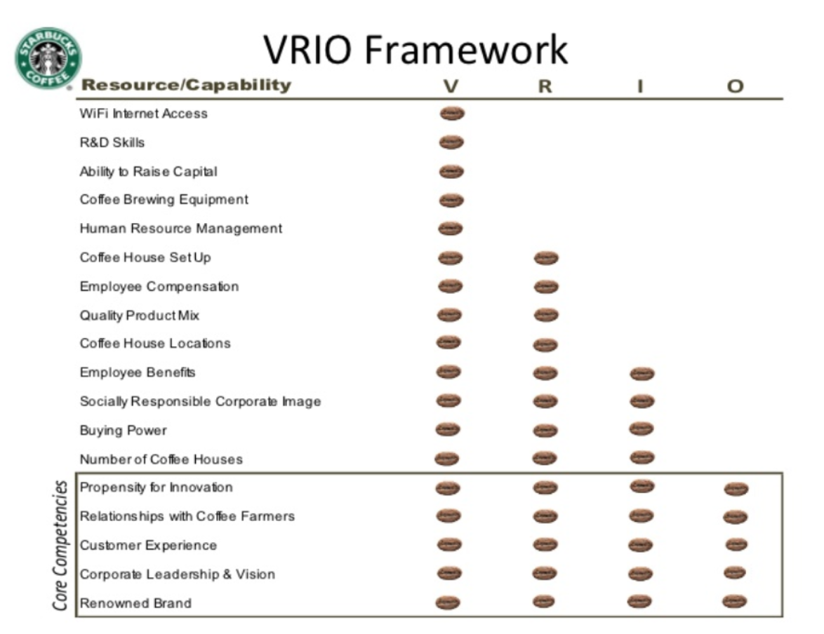 스타벅스가 가진 자원과 능력을 나열하고 VRIO에 해당하는 질문을 하면서 핵심 역량을 추출합니다.