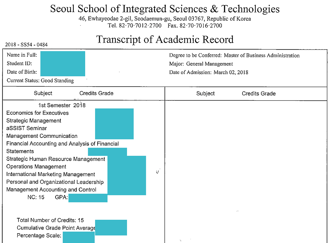 서울과학종합대학원대학교 (aSSIST, Seoul School of Integrated Sciences & Technologies)에서 Executive MBA in Seoul 과정을 듣는 학생이 된 지 6개월이 흘렀습니다. 이 성적표는 지난 6개월간 필자가 얼마나 열심히 공부했는 지를 보여줍니다. 블로그에 공부 내용을 정리하면서 복습하고 리포트도 쓰면서 밤을 지새기도 했습니다. 이미 열심히 하였기에 성적은 큰 의미가 없지만 필자가 나의 노력을 공식적으로 인정받고 있다는 느낌을 갖게 합니다.