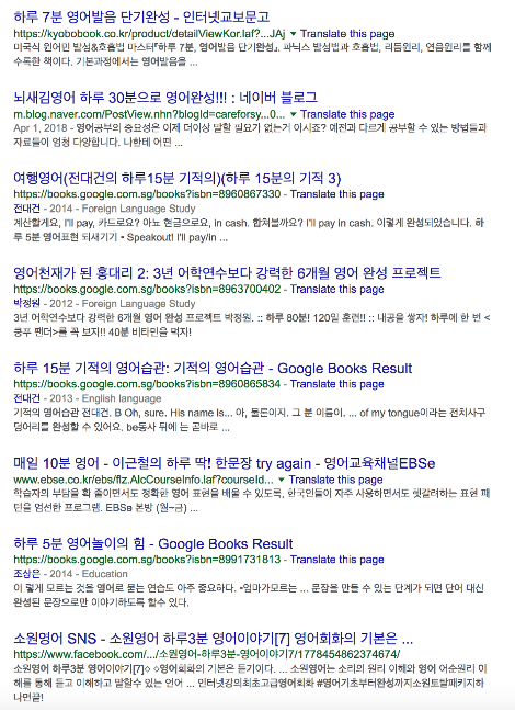 영어 공부를 결심한 사람들은 인터넷 검색을 통해 학원과 책을 알아봅니다. 구글이나 네이버에서 "하루 영어 완성"으로 검색하면 수많은 책과 학원들이 나옵니다.