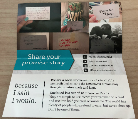 작은 한 장의 팸플릿에는 간결하게 Because I said I would가 하는 일과 약속카드를 사용하는 법이 적혀있습니다.