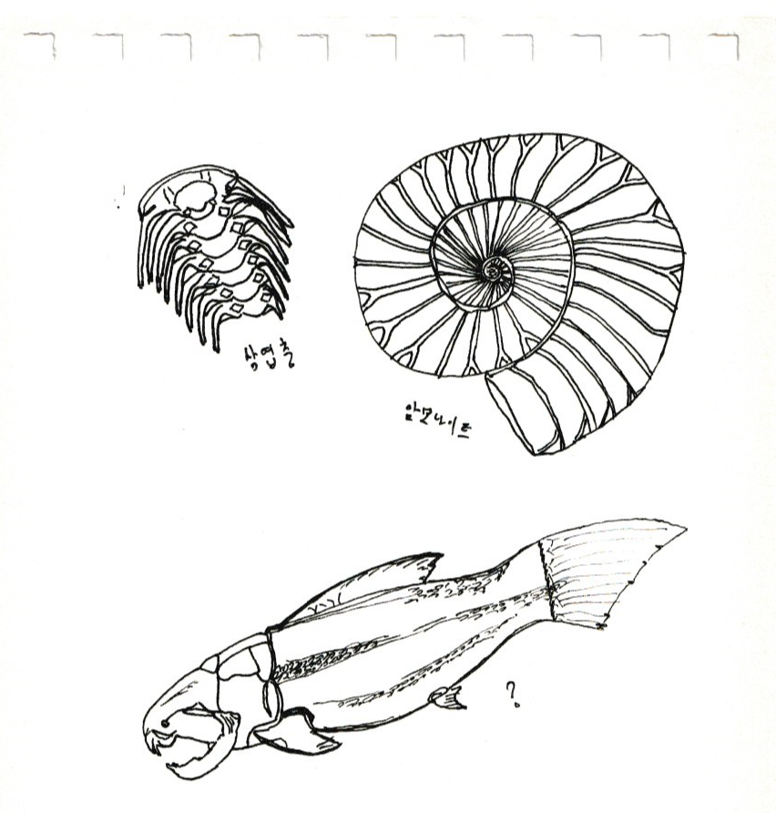 살아있는 게 그리기 어렵다는 말은 정말이다. 고양이에게 몹시 미안해서 다시는 그리지 않기로 약속한 드로잉과 비슷한 시기에 그린 고생대 생물들만 봐도 그렇다. 삼엽충, 암모나이트, 실러캔스 친척(?)은 지금은 화석이나 복원 이미지로 만날 수 있는 녀석들이다. 세상에 없는 걸 그리는 건 왠지 마음이 편하다. 없으니까, 이상해도 아무도 화내지 않으니까 그런가 보다. 같은 논리로 드로잉을 공부하지 않는 이유를 설명하면 나는 존재하는 '뭔가'를 그린 게 아니라 내가 '본 뭔가'를 그린다. 둘은 같은 것처럼 여겨지곤 하지만 엄연히 다른 게 아닐까.