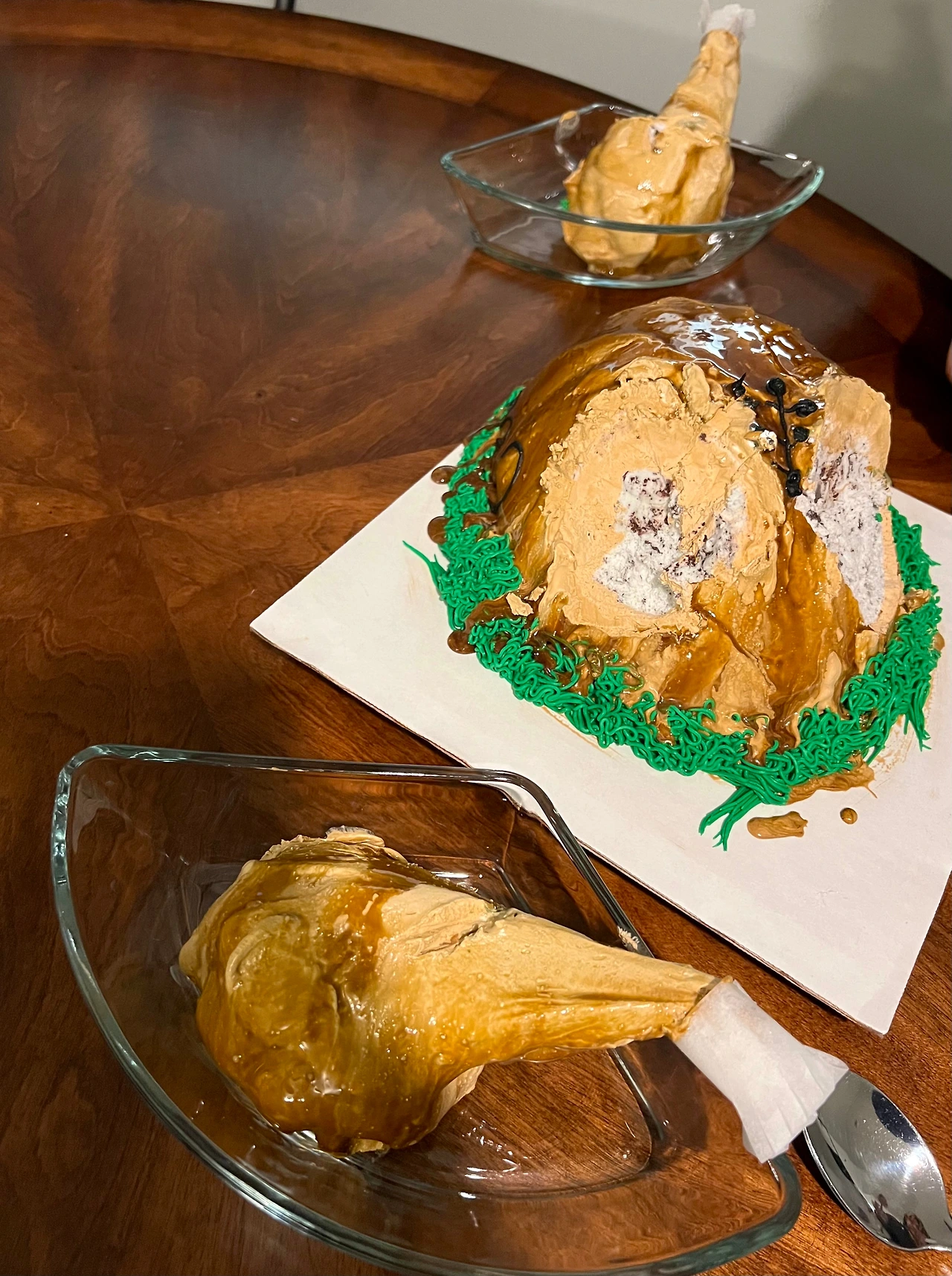 다만 칠면조 아이스크림을. 사진은 형편없어 보이나.. 실제로는 아주 훌륭한 퀄리티의 아이스크림케익이었다. 칠면조 다리를 하나씩 나눠먹을 친구가 있어 기뻤고, 이렇게 특별한 대체육(?) 옵션이 존재함에 감사했다.