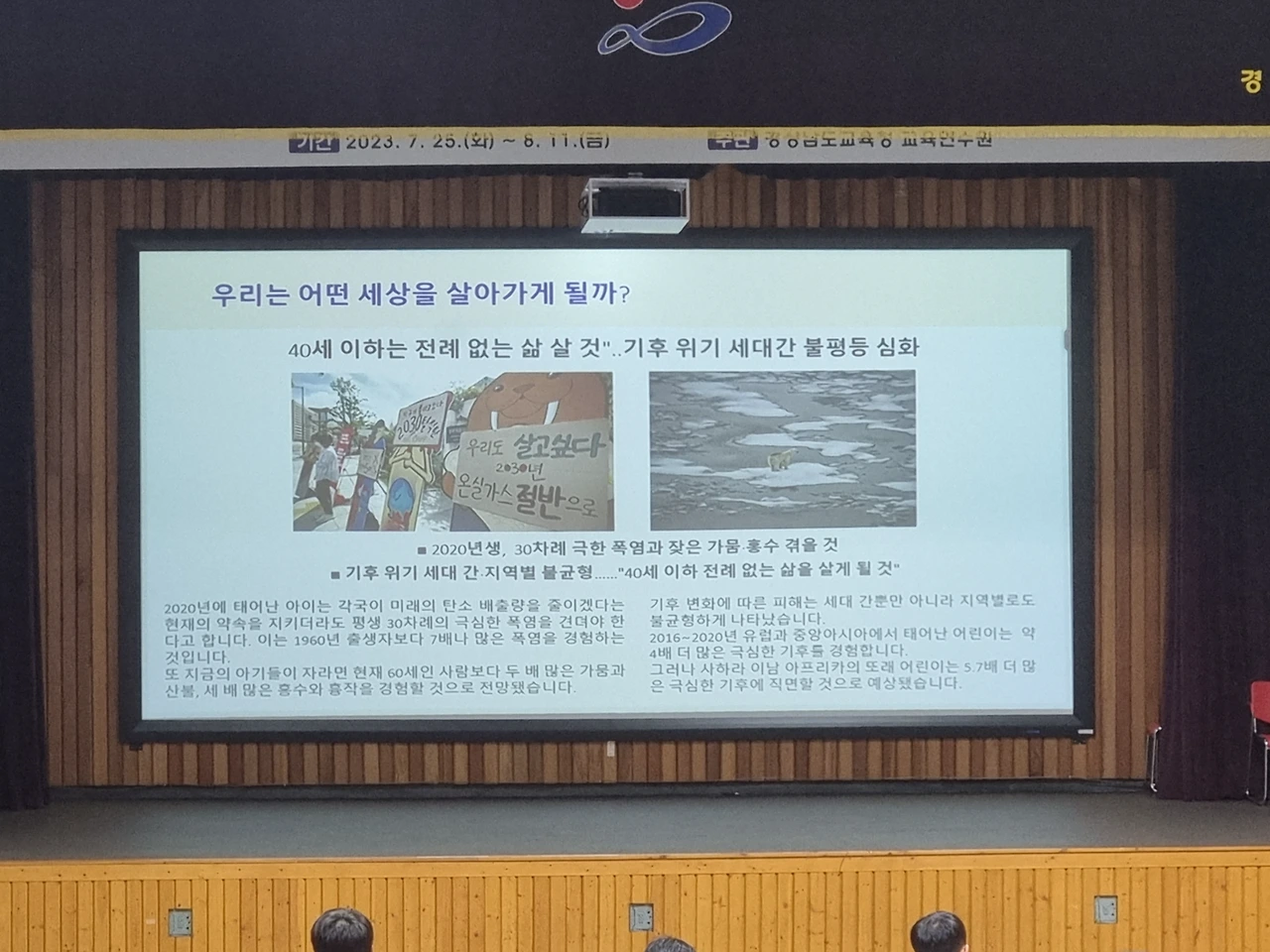 다양한 주제로 구성된 연수를 짧은 기간 동안 몰아서 들으면 내가 들었던 여러 주제들을 이어서 생각해 보게 된다. 그리고 이런 연수의 주제가 쌓일수록 머릿속에는 그 어떤 강연에서도 다루지 않았던 나만의 의문이 생겨난다. 이 땅의 흔적을 살펴보면 100여 년 전에는 국가의 존망이 가장 큰 문제였고, 그로부터 50년이 흘러서는 전쟁이, 다시 50년이 흘러서는 기후와 인류의 존망이 문제가 되고 있다. 시대별로 해결해야 하는 과제도, 다가오는 문제도 우리의 예상보다 한참 밖에 있다. 교사는 미래를 설계하는 사람이다. 미래는 사람에게서 나온다. 사람이 빚어낼 미래를 준비시켜야 하는 것이 나의 역할이건만, 나는 미래를 보지 못한다.