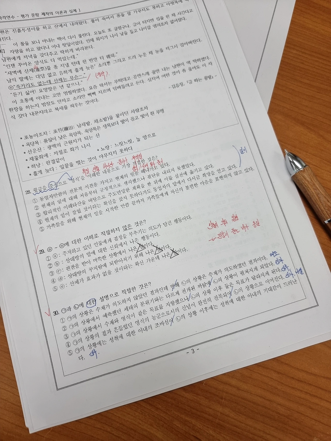교사로서 내가 가지고 있는 작은 꿈이 하나 있는데, 언젠가 수능 출제위원으로 선발되는 것이다. 평가 연수 중, 도교육청 모의고사 출제진 중 한 분이 강사로 와서 연수를 진행하였다. 내신과 수능 출제 과정을 비교하며 지문을 어떻게 선정하고 선택지의 설계를 어디까지 다듬어야 논란에 휘말리지 않는가를 듣는 것은 대단히 흥미로웠다. 기존에 출제했던 문항을 두고서 분임토의를 통해 문항 검토를 하는 경험을 가질 수 있었는데, 실제 현장에서도 해본 적이 없는 것들이었다. 비난하거나 공격하지 않는 분위기에서 문항을 더 개선시킬 수 있는 방향으로 서로 의견을 주고받는 것. 토의가 진행될수록 처음에는 생각도 못했던 문항 개선 방향들을 떠올릴 수 있었고 이런 과정 자체가 참으로 신선하고 즐거운 경험이었다.