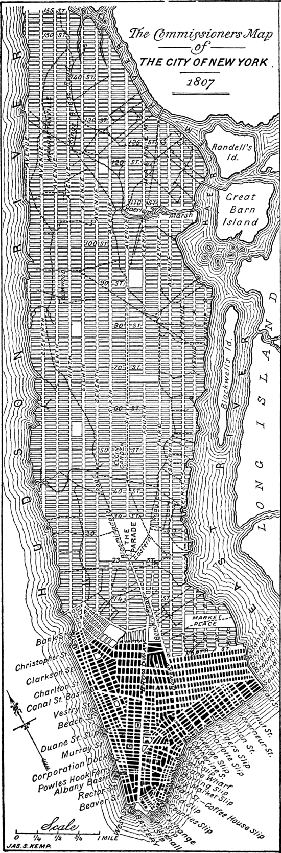 19세기의 뉴욕은 인구 10만명 남짓의 작은 도시였다. 하지만 뉴욕 시 의회는 인구 증가를 대비하여 체계적인 도시 인프라를 구축해야 할 필요성을 느꼈고, 그렇게 고안된 것이 지금 뉴욕 맨해튼의 모든 부분을 격자로 나누어 구분하고 있는 맨해튼 그리드이다. 사실 맨해튼 섬의 실제 면적은 강남구와 서초구를 합한 정도의 크기로, 그렇게 큰 구역은 아니다. 하지만 이 프로젝트가 무모했던 이유는 격자식으로 철저하게 도시를 구분하기 위해서는 평탄한 땅이 필요했기 때문이다. 맨해튼 그리드를 고안한 것은 존 랜들이라는 측량기사로, 땅을 자로 잰 듯이 격자로 나누고 도로에 번호를 부여하는 비교적 간단한 방식으로 도시계획을 만들었다. East 72nd St. 등의 도로명이 나오게 된 것은 이러한 그리드 구조가 있었기 때문이다. 동서를 연결하는 스트릿(Street)은 1번부터 150번까지 번호가 매겨졌고, 남북을 연결하는 대로 애비뉴(Avenue)는 1번부터 12번까지 번호가 매겨졌다.