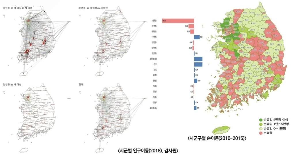 모두가 알다싶이 최근 5년간 수도권과 대도시권 신개발지역으로 인구가 집중되고 있으며, 대경권이나 호남권 농촌지역은 꾸준한 인구유출이 엿보인다.