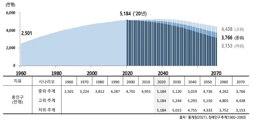 장래 인구는 2020년 기준으로 5184만 명에서 향후 10년간 연평균 6만 내외로, 2030년은 51200만, 2070년은 3766만까지 줄어들 전망이다. 2070년 인구가 1979년 수준에 이른다니 여기서도 인구의 대칭성이 드러난다. 2021년에서 2035년까지는 -0.1%, 2070년에는 -1.24% 가량 감소할 것으로 추정된다.