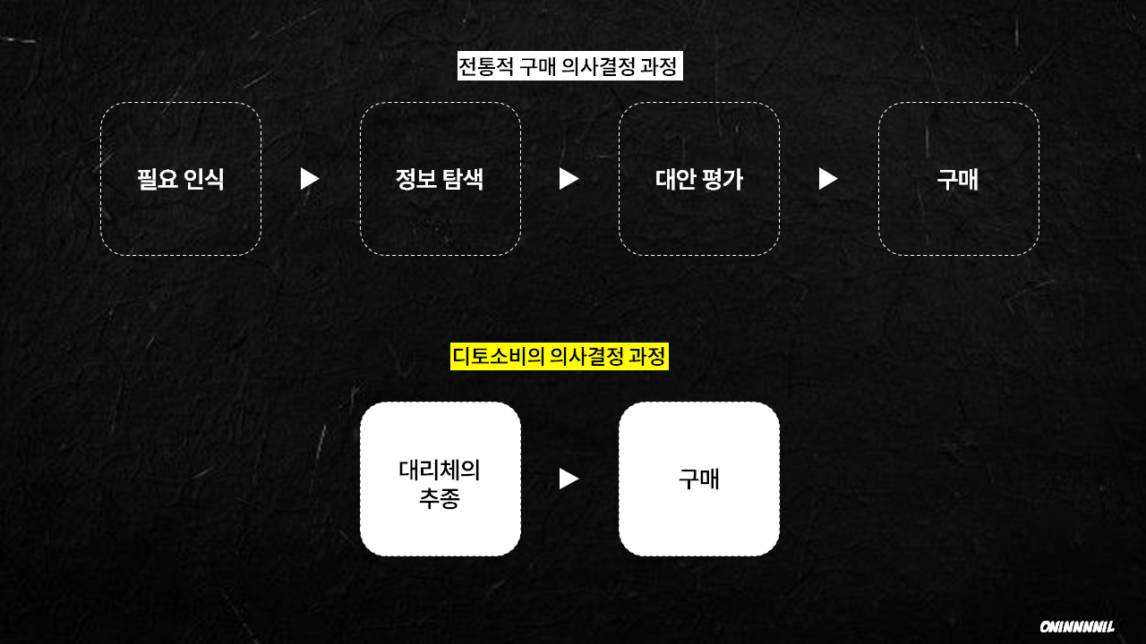 소비자들은 SNS, 유튜브 콘텐츠를 시청하면서, 이에 나오는 출연진들과의 공감대를 형성한다. 소비자는 이들을 곧 지인으로서 바라보기도 하며 친구로서 가까이 생각한다. 그렇게 이들의 영향력은 점차적으로 확대되어 나갔고, 그들은 자신의 가치관과 부합하는 유명인들이 하는 경험을 보며, 자신도 하고 싶다고 느끼게 된다. 여기서 2024년 올해 새롭게 등장하게 된 트렌드, 디토(Ditto) 소비를 주목하자.
